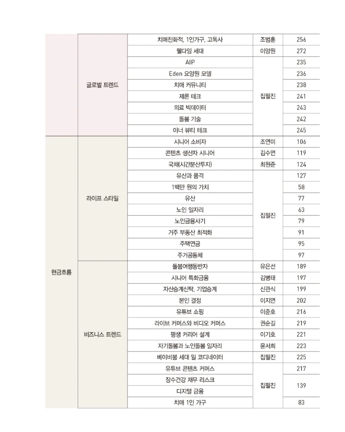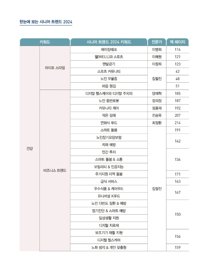 시니어 트렌드 2024, 37명의 전문가와 100여개의 트렌드 키워드가 책에서 목차로 정리되었다. 앞으로 3년 정도 지속하면서 가다듬어 가자고 출판사와는 뜻을 맞췄다.