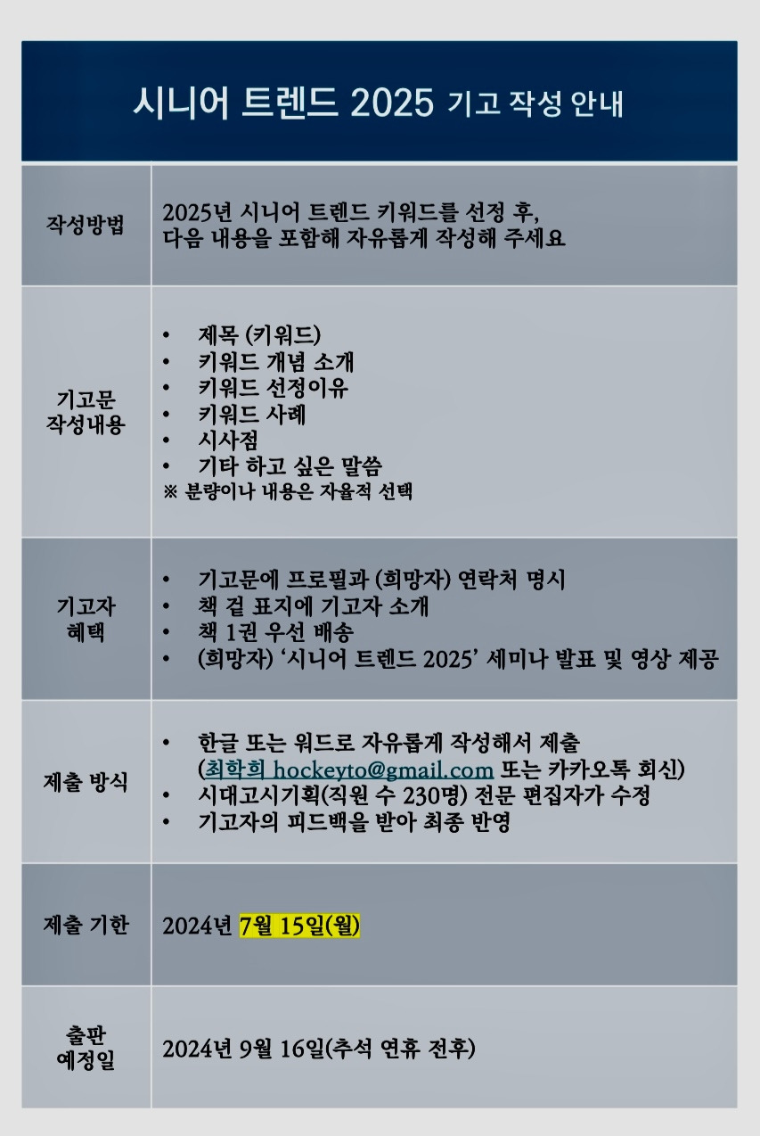 숙제는 아니지만 중요한 일인 ‘시니어 트렌드 2025’ 기고 부탁을 시작했다.