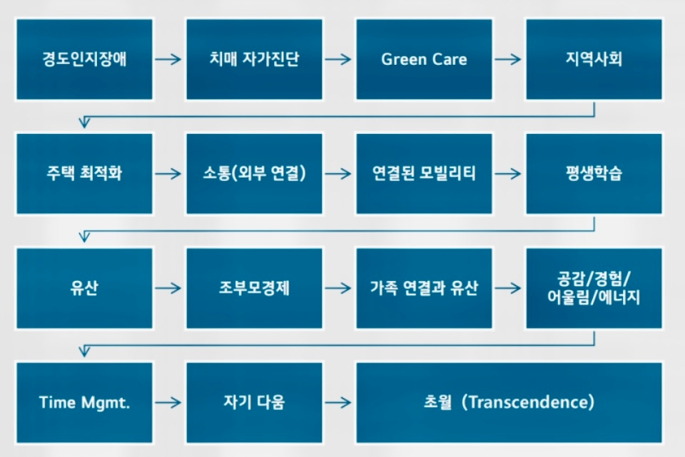 크게 4가지인데요. 먼저 첫번째는 '치매 돌봄을 고려한 주거환경'입니다. 자가진단 및 예방의 핵심 지점은 경도인지장애 단계입니다. 이후 치매 초기 중기까지 이어지는 동안 필요한 것은 'Green Care'처럼 자연 속에서 세대가 어울려 안전하고 편안한 '치매를 안고 사는 삶'을 지원하는 환경입니다. 그린케어처럼 지역사회가 연계되어 치매로 인해 격리되기보다는 치매를 안고 살아가는 주거환경이 고려되어야 합니다.