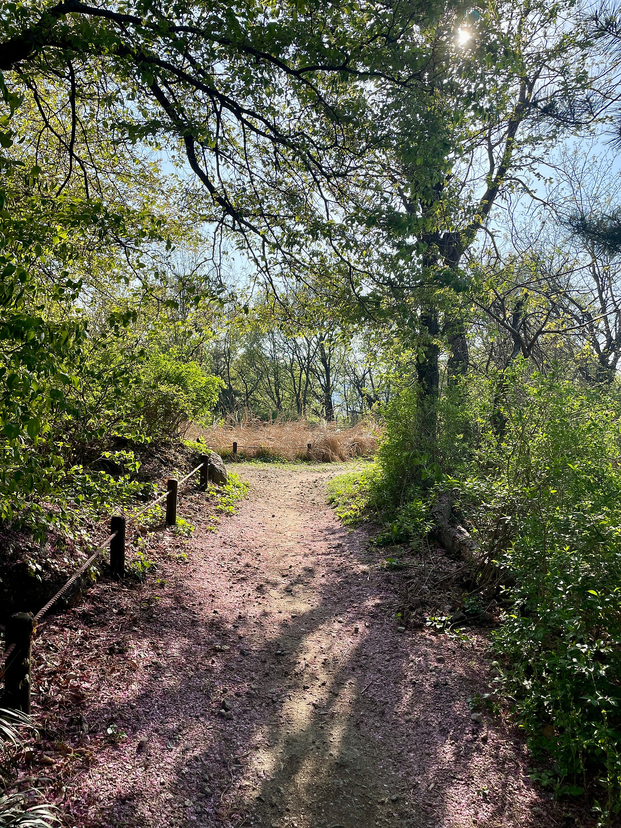 둘레길에 봄꽃의 흔적이 남아 있다.