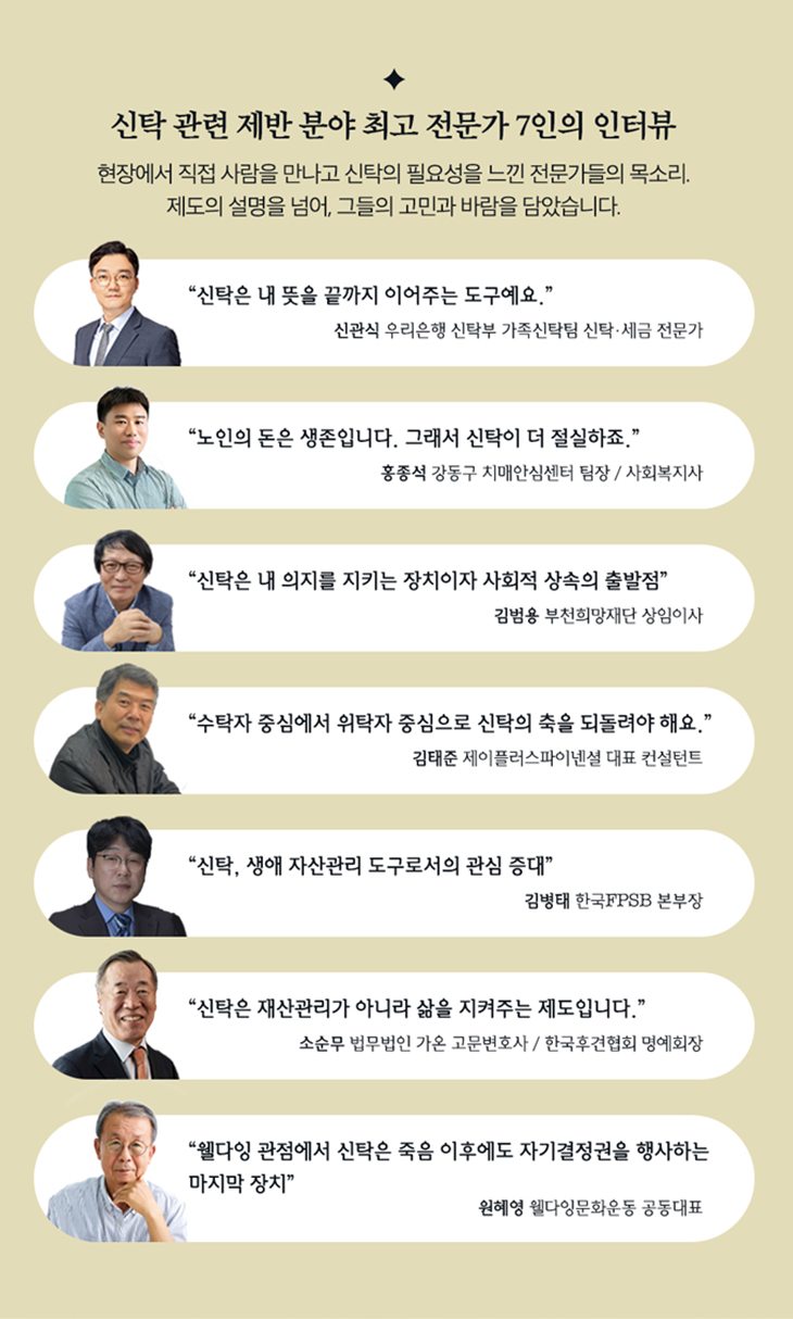 김수연 전문작가의 쉬운 글과 신탁을 둘러싼 ‘금융 법 복지 철학 교육 지역사회 웰다잉’ 전문가들의 혜안을 담고, AI집사의 폭넓은 리서치를 더했습니다. 특히 실전 신탁아카데미 모듈도 탑재했습니다. 초고령사회 거대한 부의 흐름을 좀 더 따스하게 흐르게 하고자 기획했습니다.