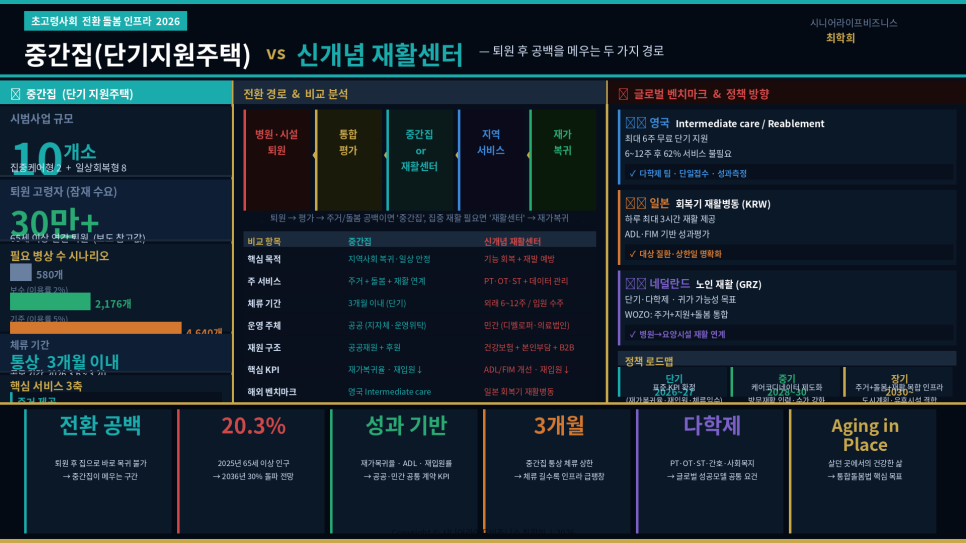 시니어케어 시장에서 중간집과 재활이 새로운 핵심 키워드로 떠오르고 있다. 병원 치료 이후 곧바로 집으로 돌아가기 어려운 공백이 있기 때문이다. 이 공백을 메우는 공간이 중간집이다. 그러나 시장의 큰 구조는 여전히 공공주도형이다. 노인장기요양보험을 중심으로 예산의 80~90%가 제도권 재원에서 나온다. 의료 역시 심사평가원과 건강보험공단의 영향 아래 운영된다.