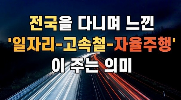 전국 주요도시를 1주일씩 묵으며 시장조사를 한 적이 있습니다.최근 전국을 다니며 공공조사를 하면서 다시 느낀 점 3가지가 있습니다.'일자리-고속철-자율주행차'가 퇴직 후 삶에 미칠 가능성과 시사점을 살펴봅니다.우리 땅에 대한 이해와 그 땅에서 살아가는 사람들에게 중요한 기초 조건들에 대해 생각해 보았습니다.https://youtu.be/i-S61zDmZog