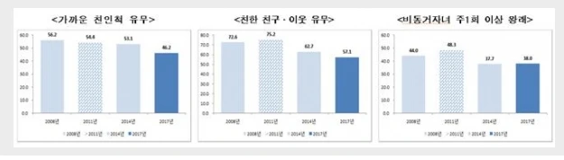 보건복지부의 2017년 자료에 따르면, 노인의 사회적 관계를 묻는 질문에 대한 응답이 점차 낮아지고 있다.