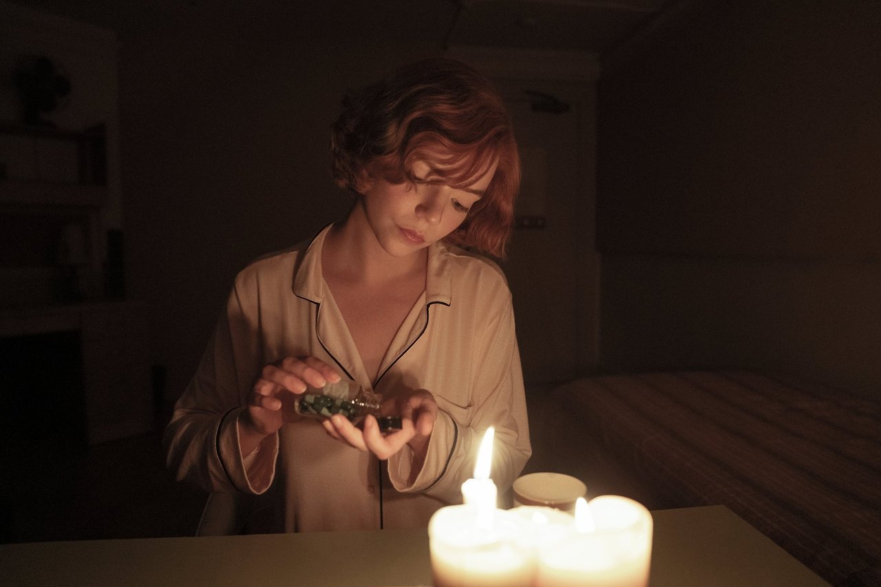 챔피언을 꺾으며 고공 승진하는 베스의 모습은 우리에게도 쾌감을 준다. 베스와 엄마는 체스 경기를 위한 각국의 여행을 다니며 오롯이 둘만의 시간을 보낸다. 하지만 엄마는 베스와 체스의 세상을 공유할 수는 없기 때문에, 베스는 여전히 고독한 싸움을 이어간다. 더 큰 판에서 도전하며, 베스는 패배하게 된다. 베스는 점차 의심과 불안이 심해진다. 본인이 생각하지 못한 수를 끊임없이 고민하며 확실한 승리를 원한다. 어떻게 보면 베스의 모습은 승리에 중독되어 있다고 볼 수도 있는데, 초록색 알약이 이 중독을 아주 단적으로 묘사한다. 베스가 보육원에 있을 때부터 초록색 알약을 복용해 왔는데, 이것은 신경안정제로 당시 보육원에서 아이들을 산만하지 않게 관리하기 위해 주던 것이다. 베스는 이미 약에 중독된 상태였고, 입양된 후 엄마의 찬장에서 같은 약을 발견하게 된다. 이 초록색 알약에 대한 베스의 욕구는 승리에 대한 욕구로 귀결된다. 베스는 언제나 약을 복용하고 나서 게임에서 승리했고, 약이 떨어질수록 불안해하며, 자신의 실력을 의심한다. 실력이 약물에서 나오는 것이 아님에도 의지하는 걸 볼 수 있다. 극 내에서 베스가 약물을 복용하면, 언제나 천장에 체스판이 그려지는 것으로 묘사된다. 우리가 베스의 천재성을 엿볼 수 있는 장치면서도, 베스가 약물을 통해서 그것을 확인한다는 걸 알 수 있는 장면이다. 베스가 경기를 진행할 때마다 바뀌는 아름다운 의상은 초록색 알약과 함께 베스가 가지는 욕망을 노골적으로 드러낸다. 작중에서 이것을 지적하기도 하지만, 이건 베스를 정말 잘 표현하는 설정 중 하나다. 가진 것이 없던 소녀가 점차 본인의 손아귀에 무언가를 담아내는 과정으로, 예쁜 옷을 입고 싶어 하는 것 자체가 베스의 인생인 것이다. 같은 약을 먹는 엄마는 마찬가지로 원하는 것이 뚜렷한 사람이다. 남편이 떠난 후 딸과 함께하게 된 그는 조금 더 원하는 인생을 살기 위해 노력한다. 원래 몸이 안 좋았던 엄마는 베스의 경기 중 세상을 떠나고, 이제 초록색 알약의 세상에서 베스는 다시 혼자다. 알약을 버리고 일어설 때다.