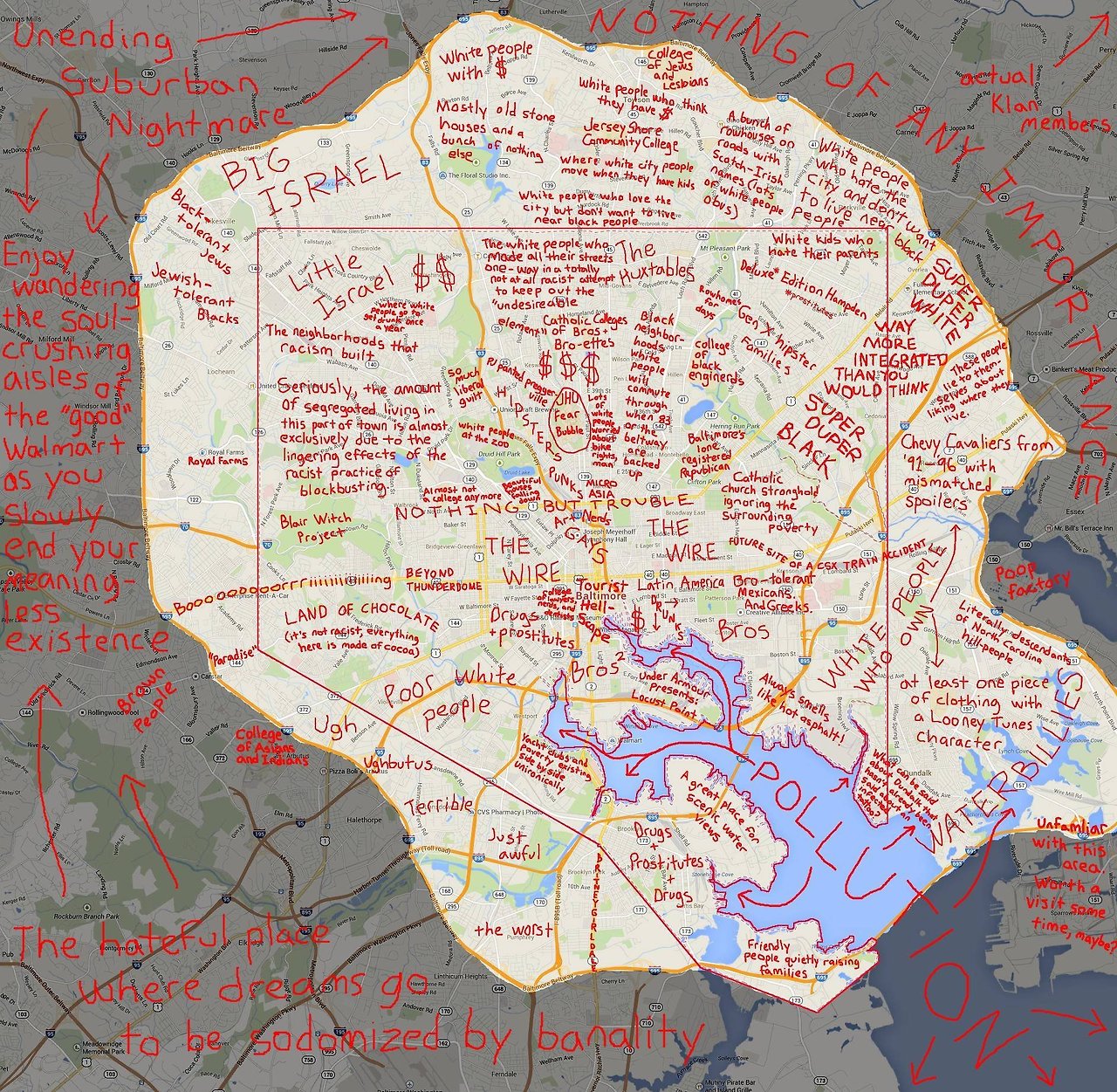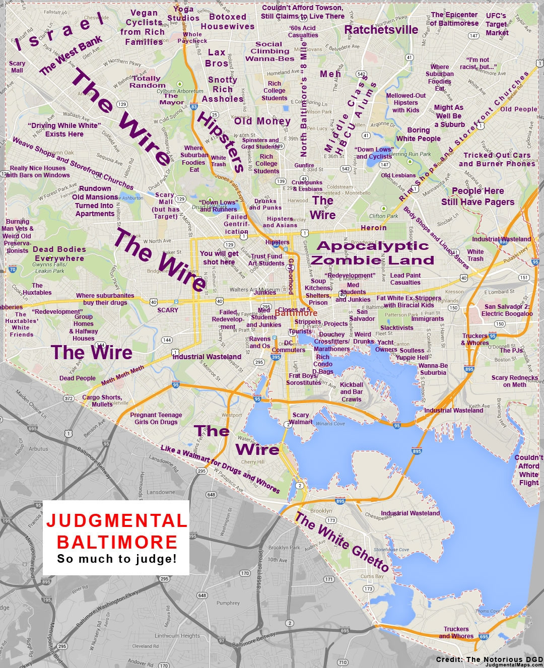 미국 인터넷의 서브컬처 중 저지멘탈맵 [Judegemental Map]이라는 것이 있다. 각 도시의 구역을 나누고 그 구역의 상징을 아주 시니컬하게 단정 짓는 일종의 풍자 밈 [meme]이다. 이 자조적인 유머 코드는 그 지역에 살아본 사람들만이 뼈저리게 공감할 수 있기 때문에 지도상에 아무리 험한 말이 쓰여 있더라도 결국 그 지역 사람은 쓴웃음을 지으며 손을 가슴에 얹고 고개를 끄덕일 수밖에 없다. 외부인은 이에 대해 신경을 쓰지 않는 경우가 대부분이다. 왜냐하면 마음속 깊은 저곳에서 울리는 공명을 이해하기 힘들기 때문이다.