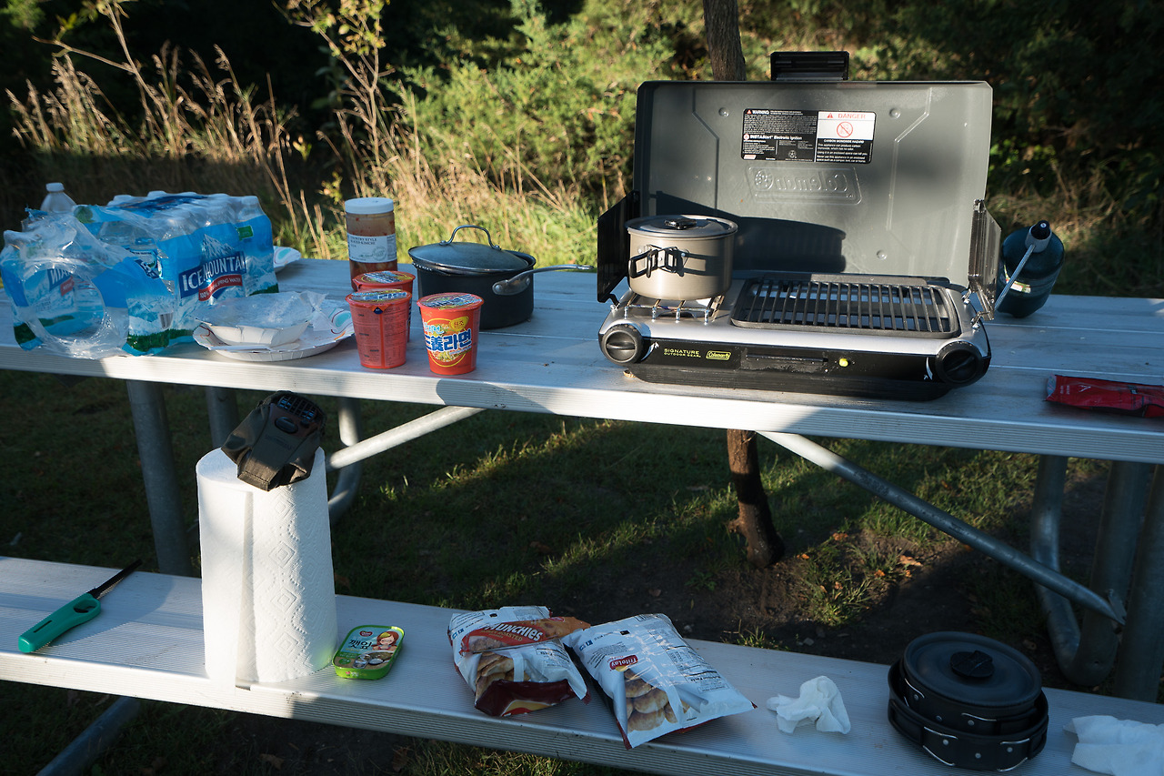 무조건적으로 챙길 것만 쳐도 식수, 냄비(코펠), 수저, 버너, 프로판가스, 아이스박스가 있다. 사실 아이스박스는 필수품과 사치품의 중간단계에 있는 아이템이라 볼 수도 있다. 하지만 김치(!)가 필요한 순간부터 필수품이 되는데 김치는 늘 꼭 필요하다. 왜냐하면 라면이 필수품(?)이기 때문이다. 그리고 최소한의 설거지용 세제와 페이퍼타월과 같은 청소용품들이 차곡차곡 더해지면 사실상 짐의 3-40%는 부엌용품들이 된다.