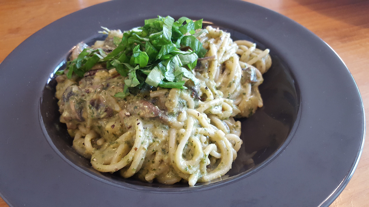 바질 페스토를 만들었다면 파스타 만드는 법은 넘 간단하다.마늘을 볶다가 양송이를 넣고 볶은 후에 삶아놓은 현미 파스타를 넣고 볶는다. 불을 끈 후에 바질 페스토를 넣고 휘리릭 저어주면 완성. 매콤한 맛이 좋다면 페페론치노나 베트남 고추를 마늘 볶을 때 넣으면 된다. 바질 잎사귀를 몇 개 남겼다가 잘게 썰어서 파스타 위에 올렸다. 주말에는 맨날 파스타.