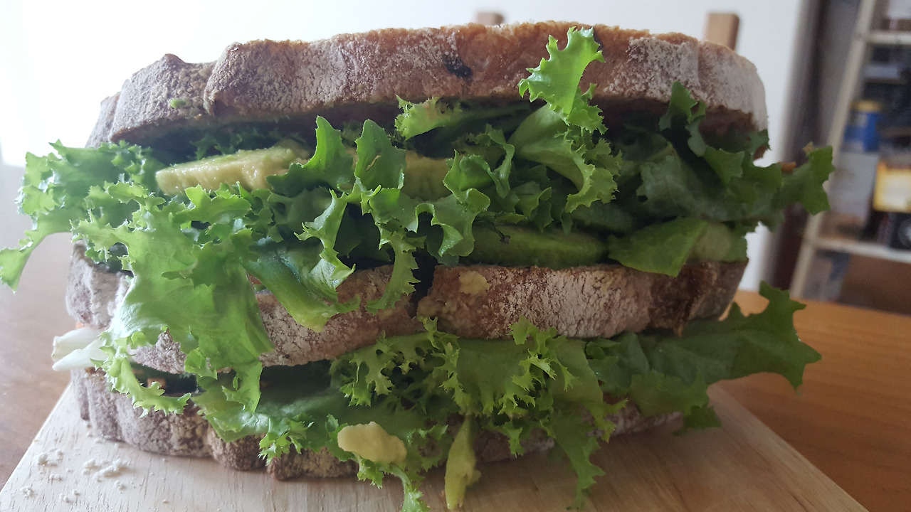 동네에 호밀빵을 맛있게 만드는 빵집이 있다. 부부가 하는 곳인데 천연 발효종으로 빵을 만든다고 한다. 오랜만에 도시락을 쌌다. 블루베리 호밀빵을 세 개나. 그 사이에 아보카도와 치커리, 보이지는 않지만 방울토마토를 잔뜩 넣었다. 치커리가 늠늠 많았던 듯. 양이 너무 많아 점심에 조금 먹고, 남겨놓았다가 저녁까지 이 샌드위치로 해결했다.