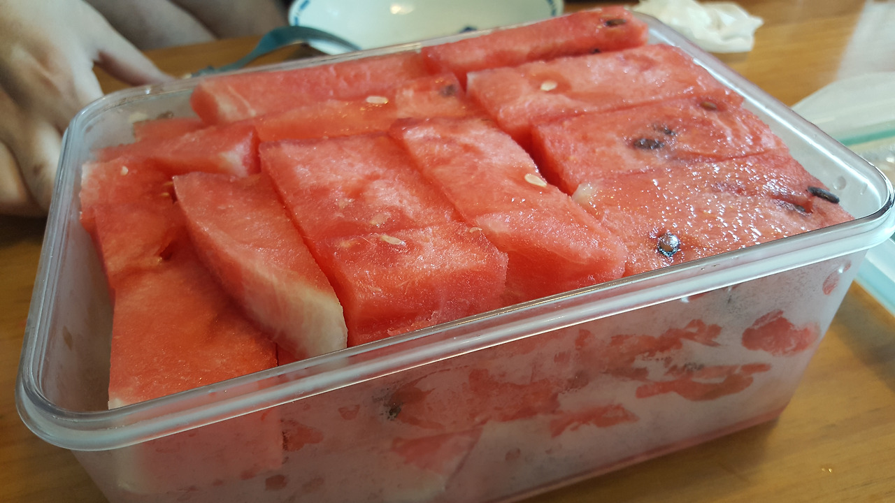 수박이 시장 마트에서 한 통에 무려 칠천 원... 밖에 안 하길래 한 통 업어왔다. 수박 한 통을 썰어서 모두 락앤락에 넣어놓았다. 네모지게 썰면 작은 락앤락 통에도 은근 많이 들어간다. 수박 한 통 썰어놓고 목이 아파서 잠시 누워있었다... 하지만 먹는 데는 며칠 안 걸렸다는... 수박을 먹으려고 기다리는 저 초조한 손의 주인은 남편이다.
