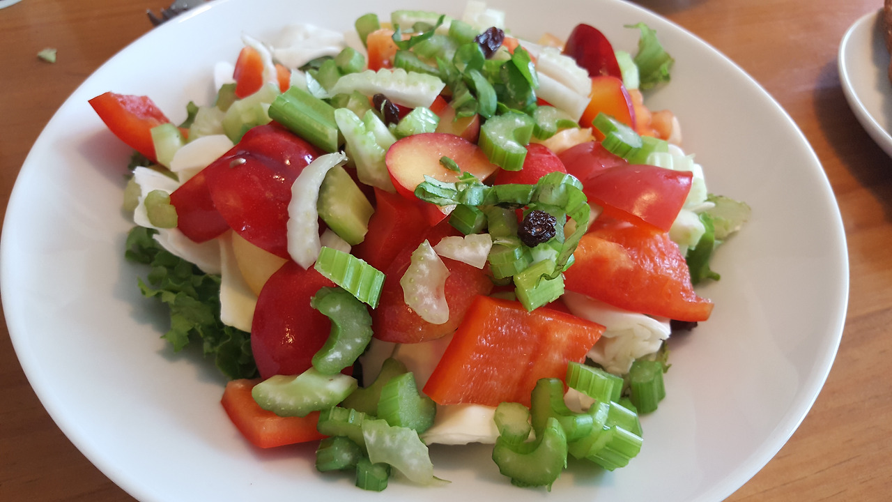 곁들여 먹은 샐러드다. 자두와 파프리카, 치커리, 샐러리, 양배추 등등을 잔뜩 넣어 소스 없이 먹는 샐러드. 색깔 조합이 마음에 든다.