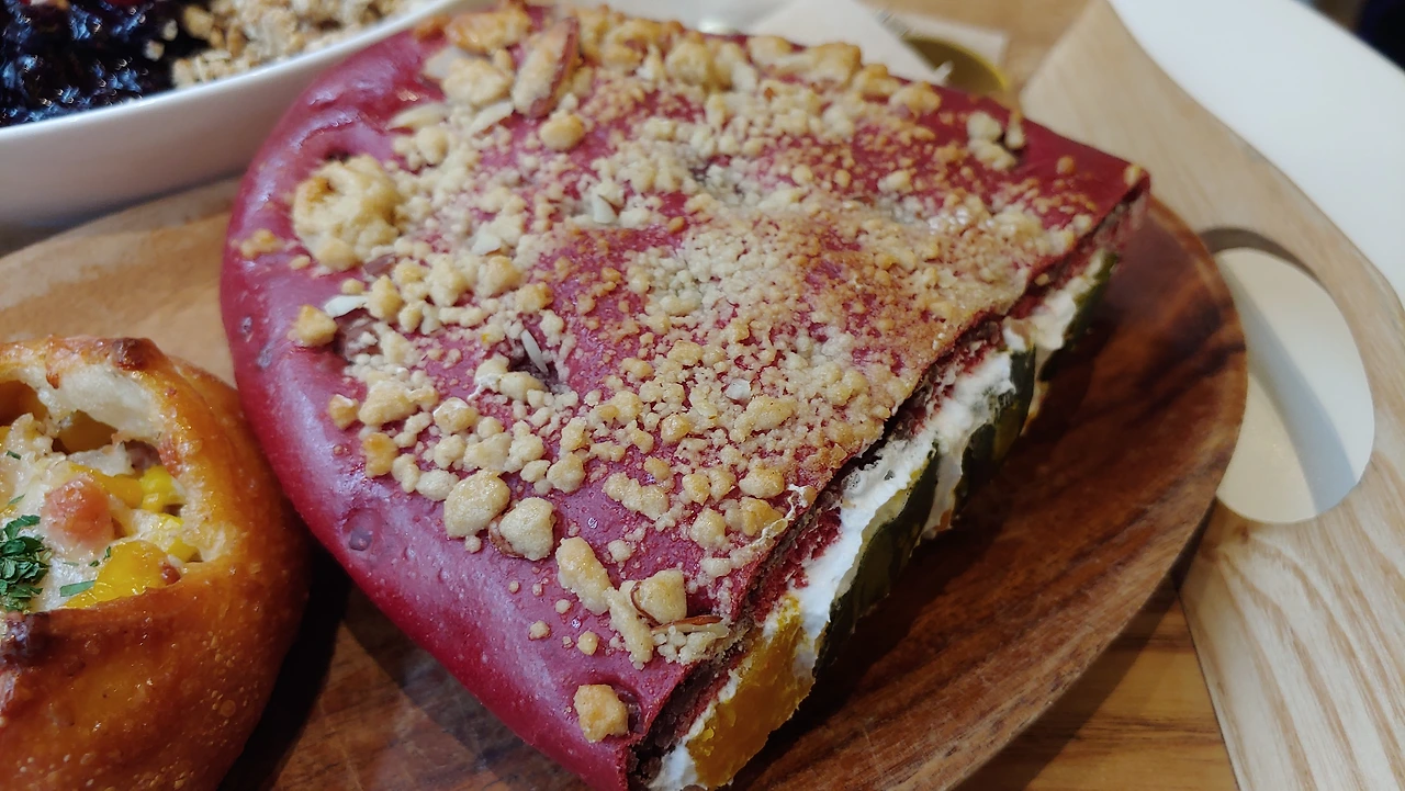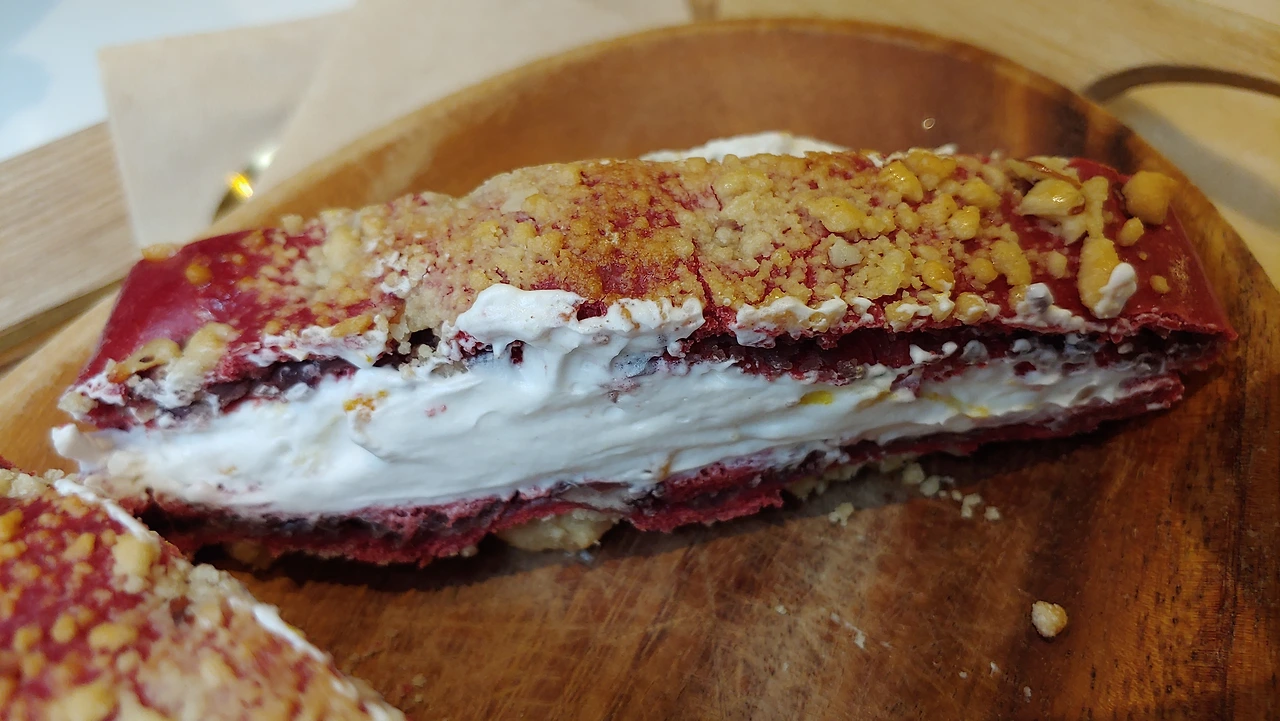 단면을 잘라본 것. 코코넛 크림으로 추정되는 비건 크림을 아주 듬뿍 넣었고, 사진에는 잘 보이지 않지만 단호박도 꽤 큰 덩어리가 들어있다. 어떻게 비건으로 이런 맛을 냈는지 궁금해진다.