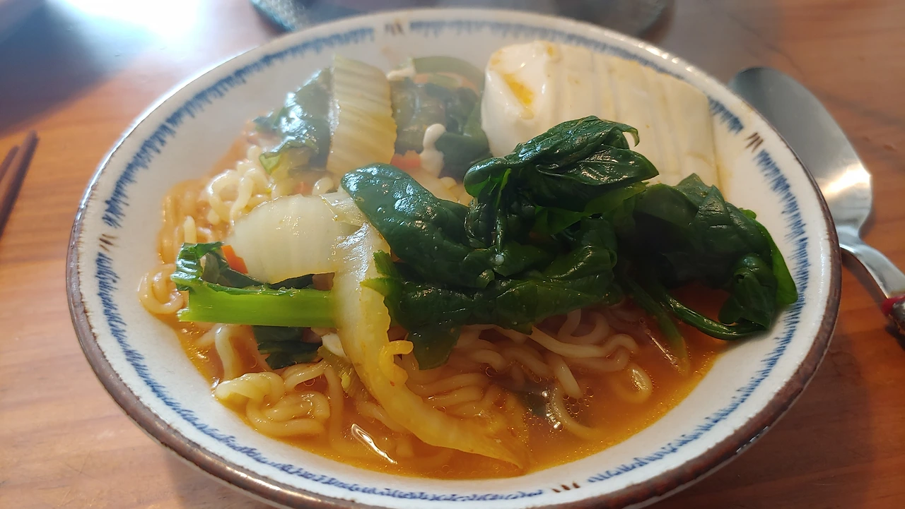 한살림 순두부와 배추 겉잎, 시금치를 왕창 넣어 끓인 비건라면. 풀무원에서 나온 정면. 겉절이엔 라면이지.