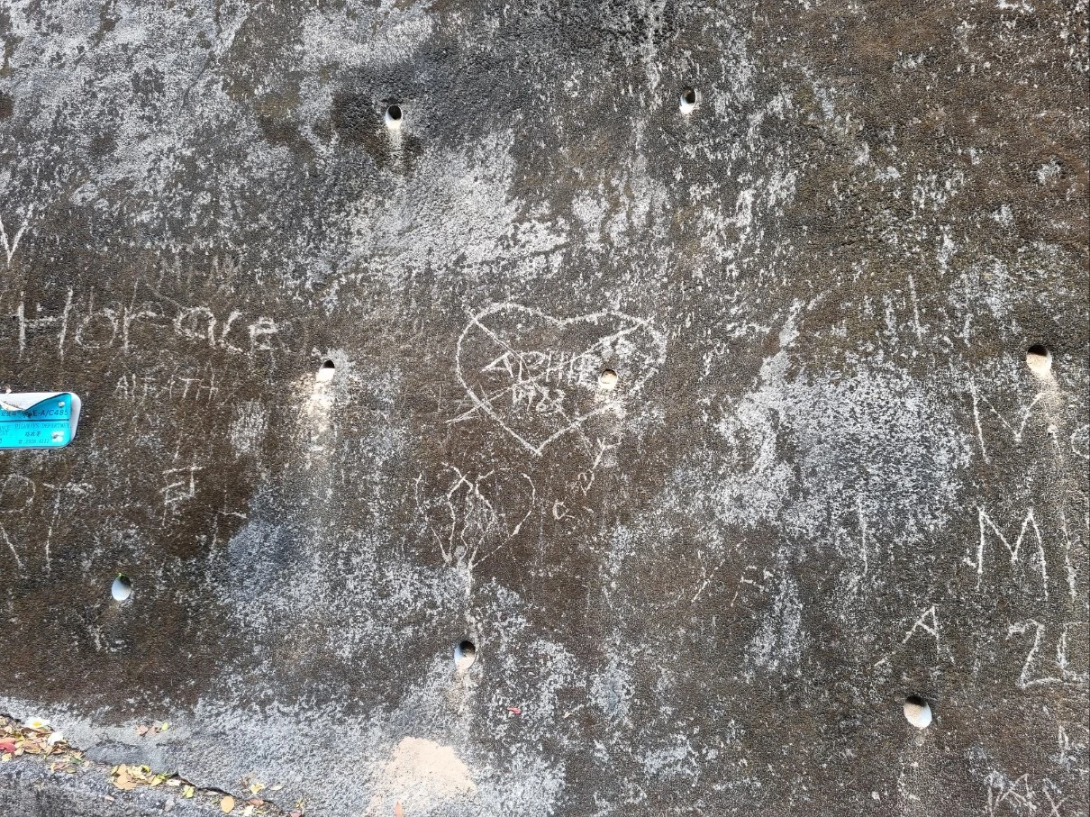 대충 들러본 후 산에 올랐다. 산은 별 하나짜리 답게 많은 등산객들과 산책하는 동네 사람들로 붐볐다. 게다가 처음부터 끝까지 포장도로다. 급한 오르막은 없지만 꾸준히 올라간다. 지루할만하면 시내를 볼 수 있는 경치가 나왔고 강아지와 함께 올라가는 사람, 학생들, 동네 주민, 노인들도 있고 홍콩 거주민인 한국 사람들도 올라간다. 사람들과 같이 오르다 보니 사면에 낙서가 많다. 그중 전형적인 하트에 이름을 쓴 낙서. 사랑이 깨진 후 뒤늦게 와서 엑스자를 쫙쫙하고 그은 걸까?
