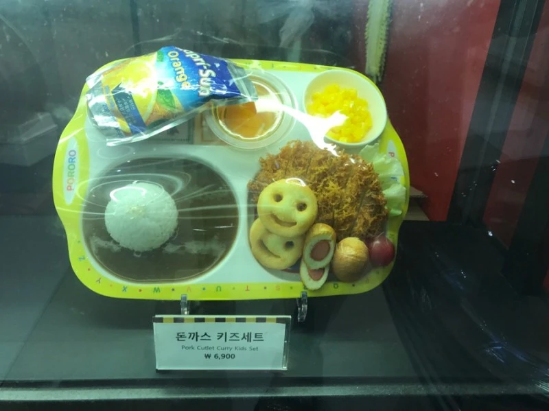 코코이찌방야의 키즈 메뉴는 '돈까스키즈세트' 단 한 가지이다. 덕분에 고민할 필요가 없어 좋다. 둘째는 처음 먹어보는 메뉴라 남길지도 모르니 일단 키즈메뉴 두 개만 시켜본다. 주문 후 기다리니 다음과 같이 나온다. 음식 모형과 큰 차이가 없어 다행이다. 이론과 실제가 같다고 해야 하나.