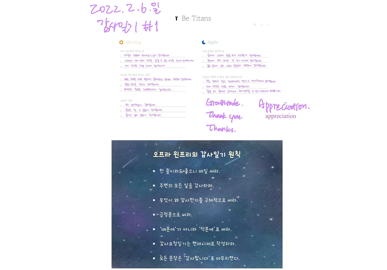 영어로 감사합니다는 Thank you 만 있는 줄 알았다. 하지만 알고 보니 gratitude, appriciation 등 다양한 어휘가 있었다. 우리말은 감사합니다와 고맙습니다 정도인데 그 정도의 뉘앙스일까. 감사일기를 쓰려고 보니 별게 다 궁금해진다. 오프라윈프리의 강연을 듣고 감사일기가 쓰고 싶어졌다. 오늘부터 차곡차곡 담아보려 한다.