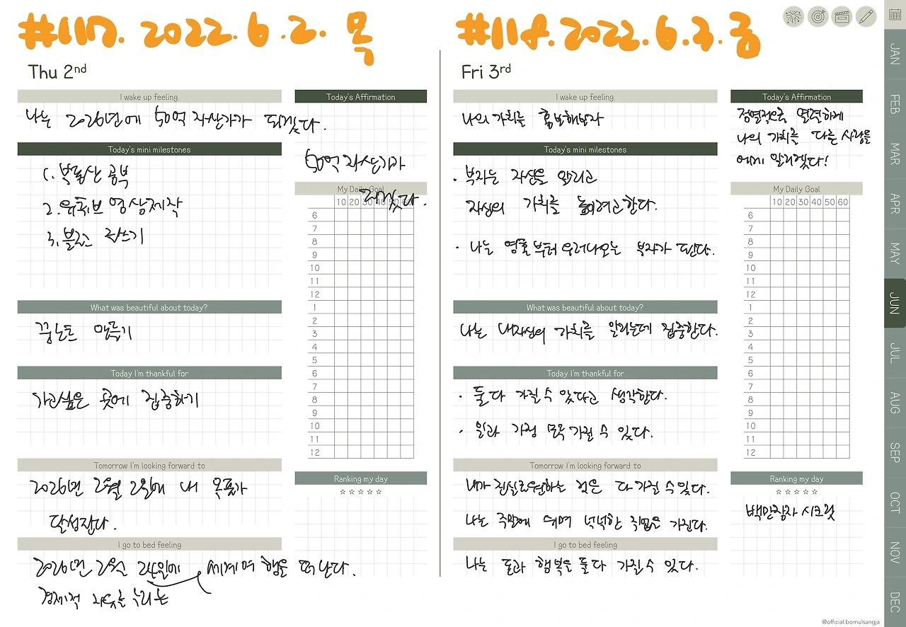 <118일간의 감사일기 by 용감한 하늘의 심판자> 2022년 2월 6일부터 2022년 6월 3일까지 감사일기를 쓰고 기록하기 시작했습니다. 저를 향한 소소한 사랑의 순간들을 그려나가기 위해 시작했습니다. 사건, 반응, 생각에 대한 정리를 담아봅니다. 무엇인가를 인지하는 순환에 대한 저의 뇌를 살펴보고자 합니다. 작은 사건에 반응하는 저의 느낌, 찰나와 함께 생각하는 저의 모습을 기록해 봅니다. 생각은 행동을 일으키고 하나의 사건이 됩니다. 사건이 진행되는 순간 자극이 되고 새로운 생각이 생겨납니다. 타인에 의한 사건발생은 스스로 의도하지 않는 사건입니다. 반응과 생각은 사건의 영향을 받게 됩니다. 우리가 스스로 통제하고 개입할 수 있는 부분을 찾아봅니다. 저는 좋은 생각을 하는 힘으로 잘 헤쳐나갈 겁니다.