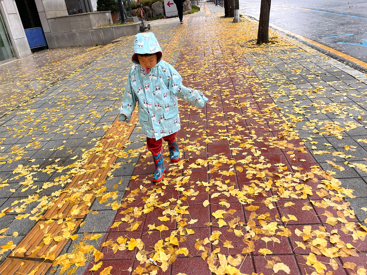 비가 오는 하원길이었다. 비가 종일 온다는 일기예보를 침고해 아침에 우비를 입고 장화를 신겼다. 다행이었다. 버스를 타고 집에 가고 싶은데 비가 오는 날이니 우산을 쓰고 걸어서 하원하겠단다. 물웅덩이를 첨벙첨벙 뛰느라 신이 났다.
