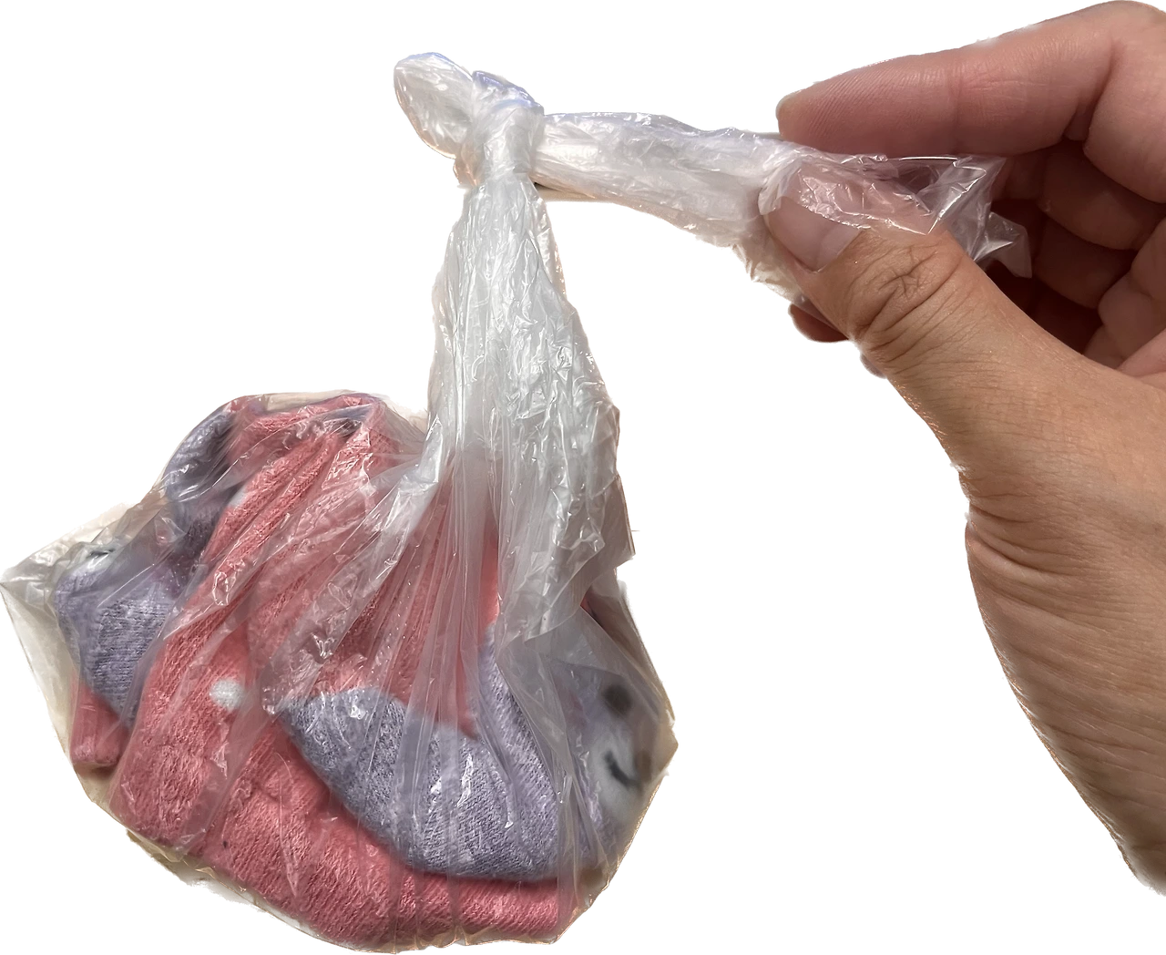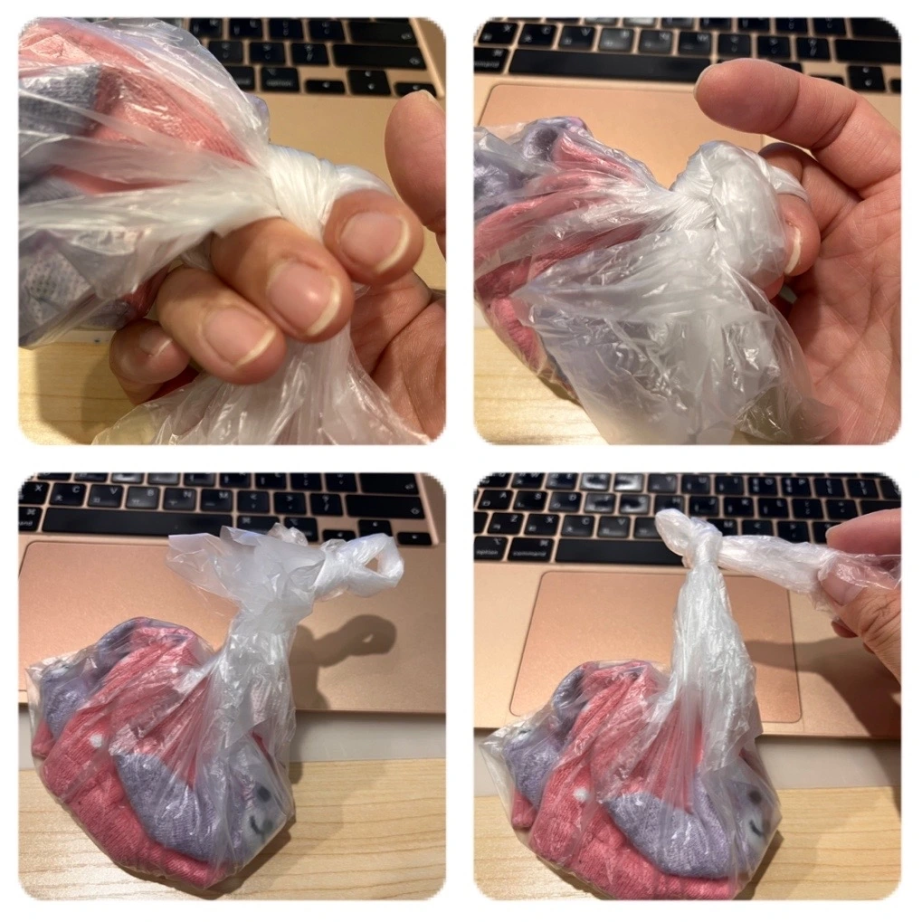비닐봉지 끝을 잡을 때 검지와 중지 손가락을 넣고 평소와 같이 묶는다. 그러면 검지와 중지손가락이 들었던 곳에 고리가 생긴다. 고리가 생기도록 묶어두면 다음에 풀을 때 고리 반대편 끝자락을 당기면 쉽게 풀린다.