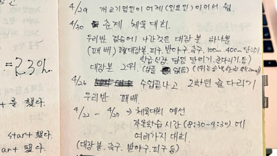 1991년 대장볼 1위를 한 반은 200원짜리 공책 한 권씩 받았는데, 대장볼 2위 한 우리 반은 상품이 없었다. 춘계체육대회의 종목은 대장볼, 피구, 발야구, 축구, 100m 달리기, 400m 달리기, 학급실장과 담임선생님 달리기, 줄다리기 등이 있었다. 대장볼은 무엇이었을까. 기억나지 않는다. 일기가 없었으면 영영 묻혀있었을 나의 중학교 2학년 체육대회의 기록이다.