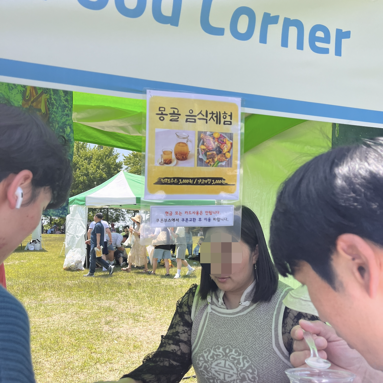 ‘행사하는데 이런 잡상인들은 통제해야 하는 거 아니야’라는 생각이 머리끝까지 들었다. 일단 달고나를 먹고 싶다며 징징거리는 아이를 끌고 돗자리와 캠핑의자 3개가 든 무거운 카트를 내려놓을 장소를 찾았다. 공원을 둘러보니 공원 가운데 메인 행사장 위에 참여부스가 있었다. 그 옆으로 다문화먹거리를 판매하고 있었다. 나무그늘 밑에 돗자리를 펴고 무거웠던 짐을 풀었다. 이제 행사장을 한 바퀴 둘러보고 아이가 원하는 간식을 사줄까 했다. 판매부스를 보니 한쪽에서 판매하는 쿠폰을 사서 원하는 나라의 음식을 사 먹으면 되는 구조였다.