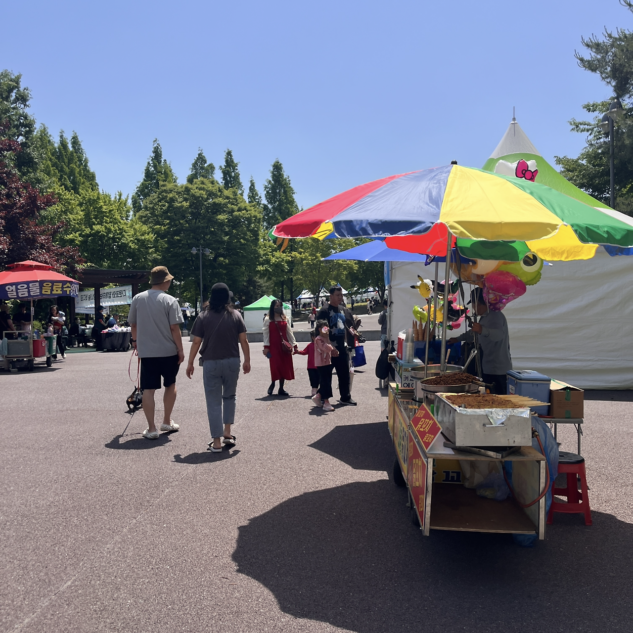 집 근처 공원에서 축제를 한다는 현수막을 보았다. 주말이라서 아이들과 함께 다녀오기로 했다. 누나는 숙제가 있어 집에서 마저 하고 아빠와 함께 오기로 했다. 아들과 엄마는 공원에서 펴고 놀 돗자리와 캠핑의자 몇 개를 챙겨서 미리 자리를 잡으러 출발했다. 평소와 다르게 공원입구에는 솜사탕기계와 달고나를 파는 사람들, 다문화 한가족 축제 행사의 일환으로 옷과 신발 등 공산품을 바자회처럼 저렴한 가격 5천 원, 3천 원, 1천 원 등에 판매하는 사람들이 보였다.