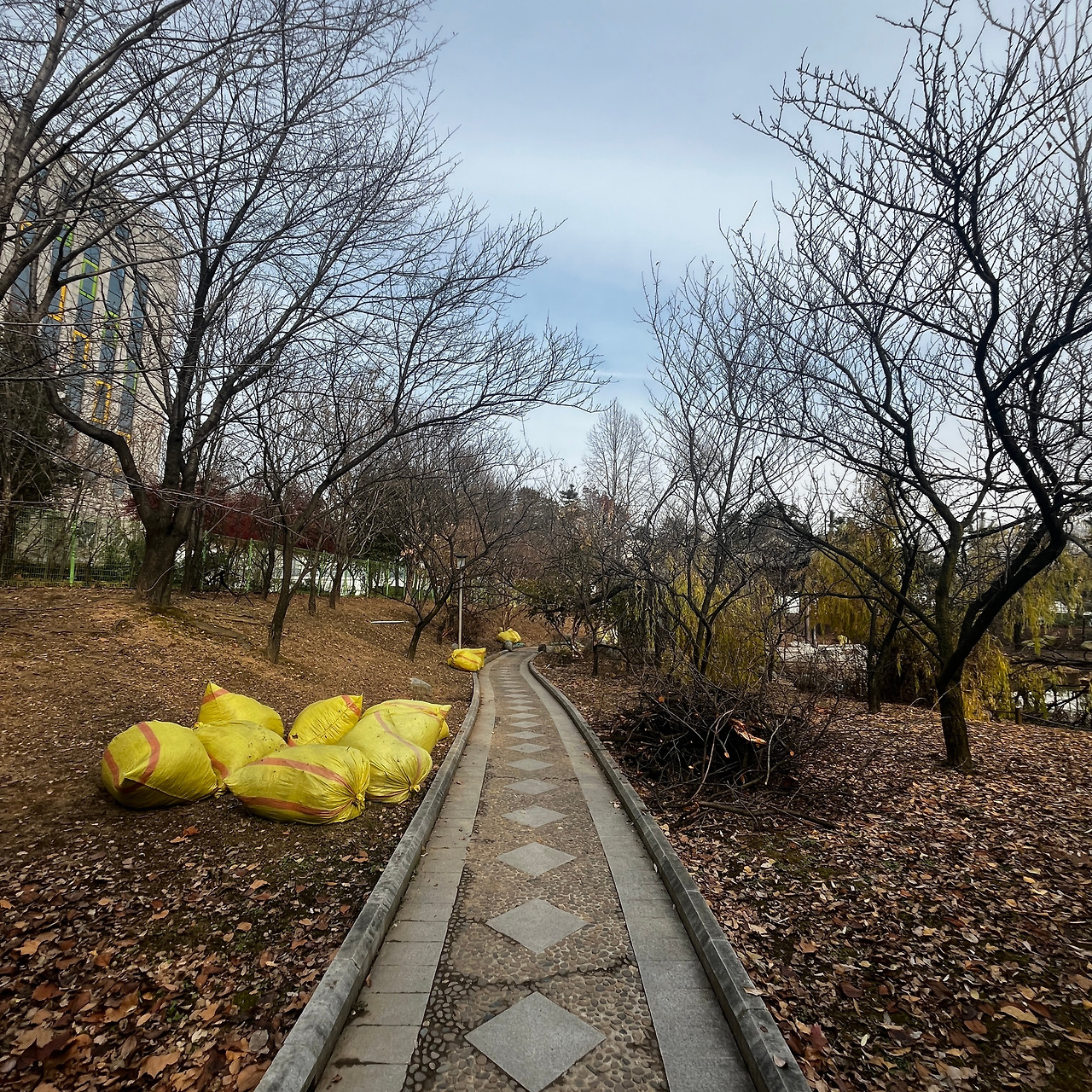 아들과 공원에 갔다. 공원 입구에 서있는 나무의 낙엽이 모두 떨어져 나뭇잎이 하나도 달려있지 않았다. 그 뒤로 소나무의 푸르고 초록초록한 잎은 추운 겨울에도 남아 초록색 배경으로 서있었다.