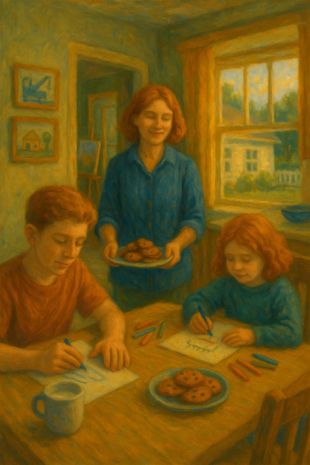 아줌마는 놀란 듯 살짝 눈을 크게 떴지만, 곧 부드럽게 웃었다. “그래, 들어와. 지금 쿠키 굽고 있었는데 괜찮다면 먹고 가렴.”
