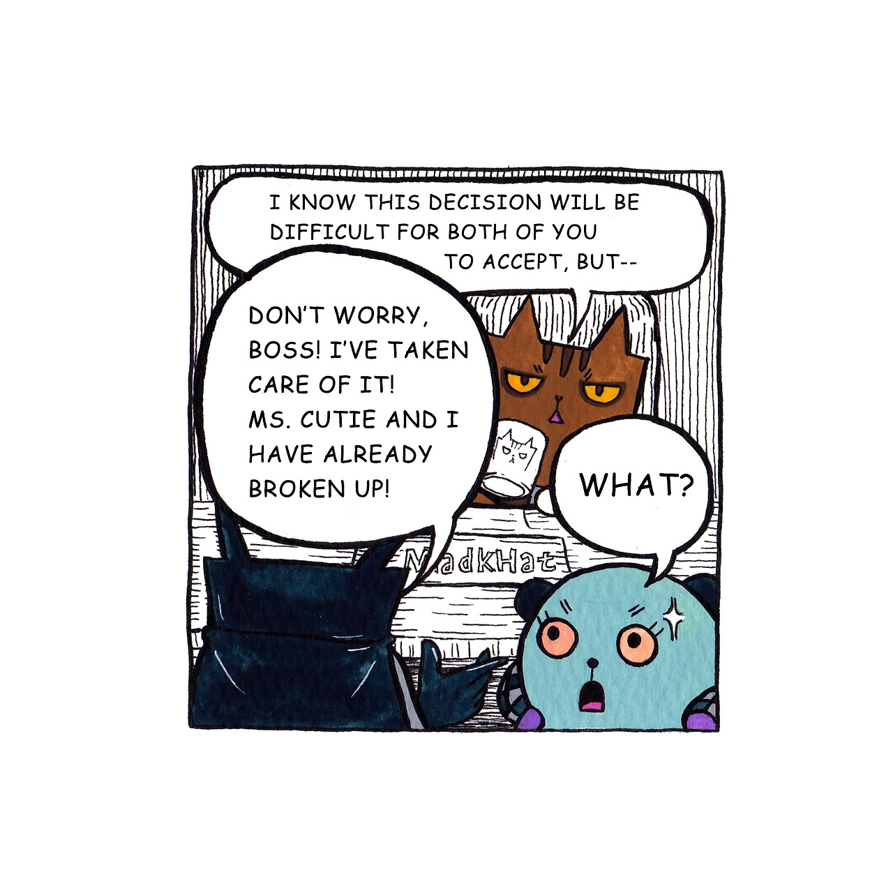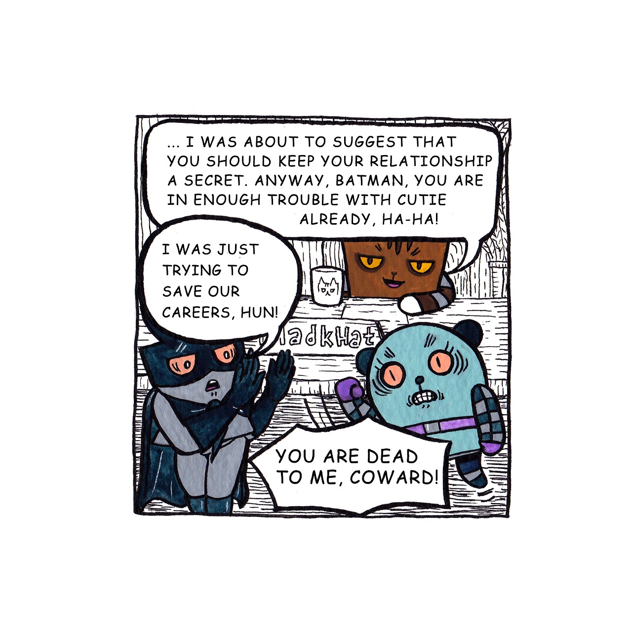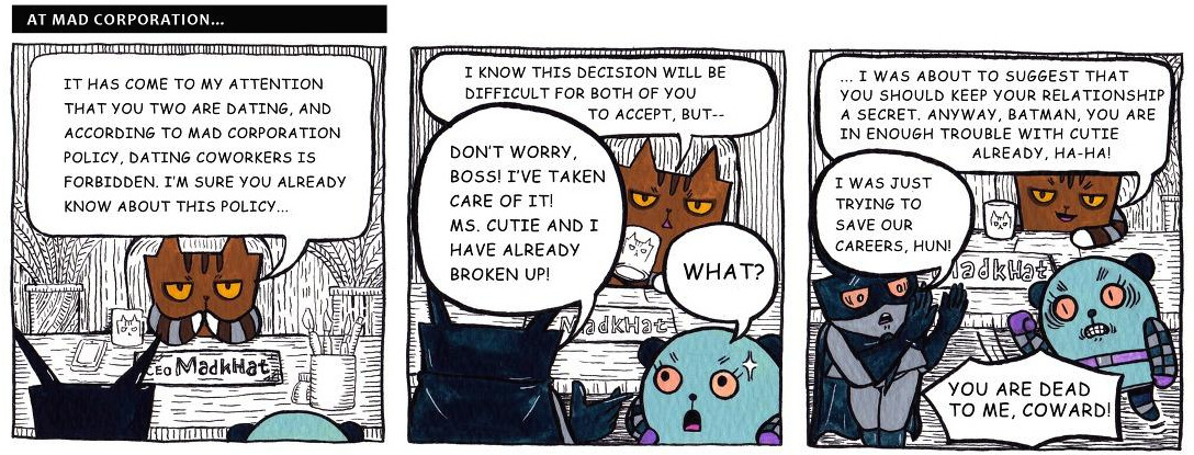 [매드캣] ...난 두 사람 관계를 비밀에 붙이라고 제안하려던 참이었는데요. 어쨌든, 배트맨 대리는 이미 큐티 대리와의 문제만도 충분히 복잡한 것 같네요, 하하!