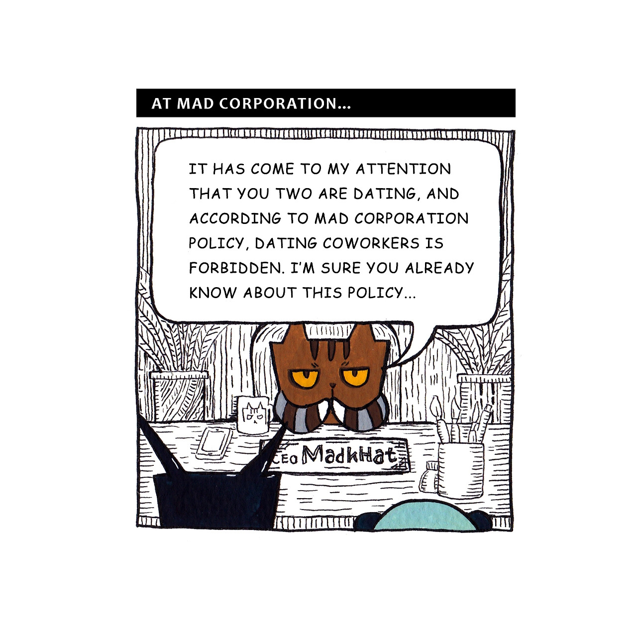 [매드캣] 두 사람이 사귀고 있는것을 제가 목격하였고, 매드주식회사의 정책에 따르면, 동료와 교제하는 것은 금지되었습니다. 분명 두 사람도 이 정책에 대해 이미 알고 있을 것이고요...