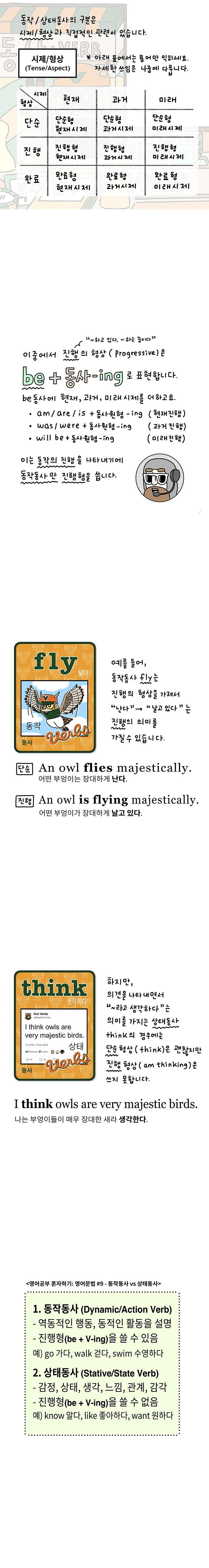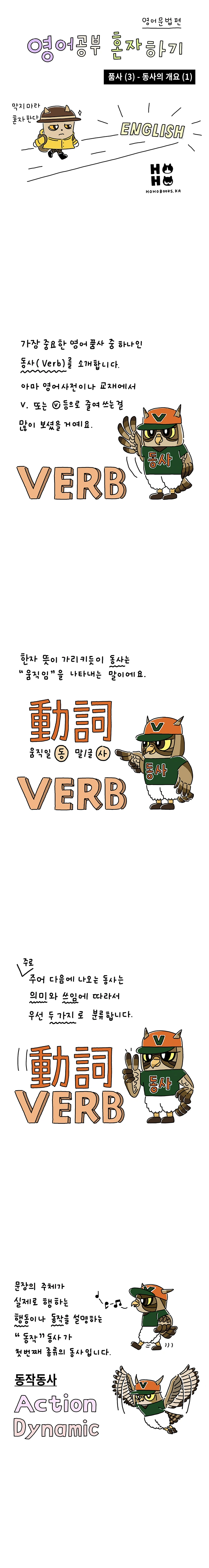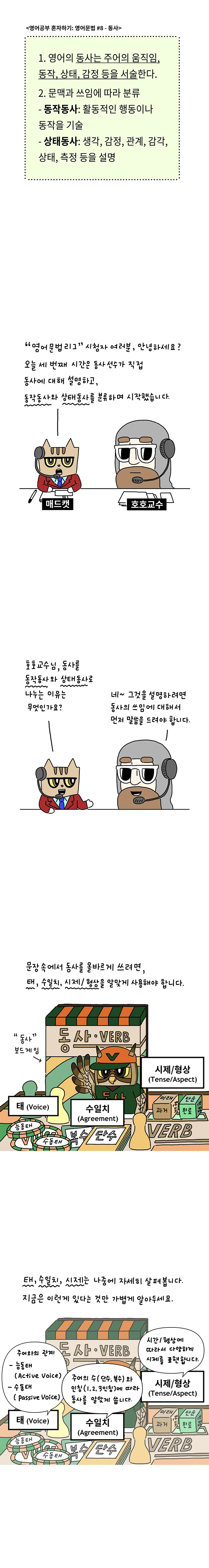 만화 내용에 나온 것처럼, 동사는 영어의 중심이고 가장 중요합니다. 만화로 그린 내용은 동사에서 가장 기본적인 부분이지만 기본적이기에 가장 중요하기도 합니다. 이 부분에 대해 개념이 잡혀 있지 않으면 이후의 영어 학습에 힘들어지는 경향이 있습니다. 따라서, 기본부터 철저히 살피실 수 있으면 좋겠습니다.
