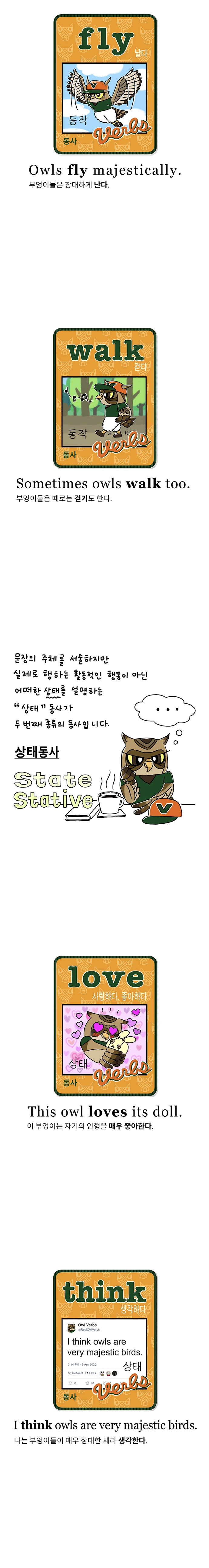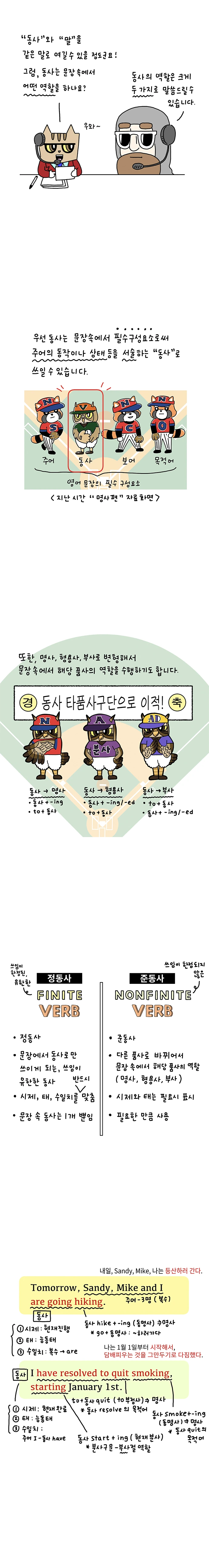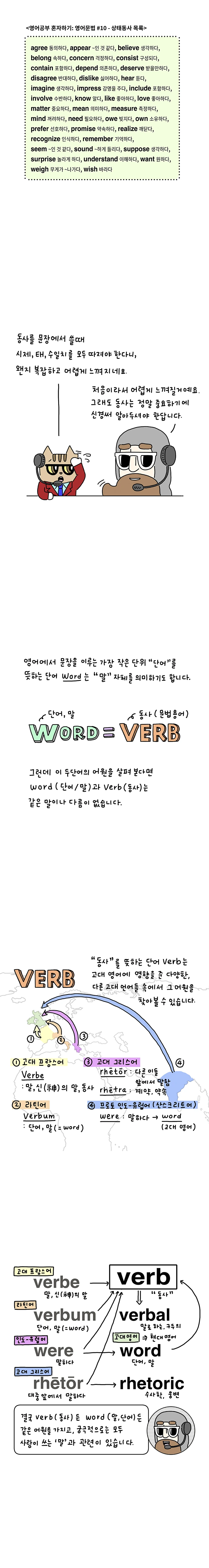 만화 내용에 나온 것처럼, 동사는 영어의 중심이고 가장 중요합니다. 만화로 그린 내용은 동사에서 가장 기본적인 부분이지만 기본적이기에 가장 중요하기도 합니다. 이 부분에 대해 개념이 잡혀 있지 않으면 이후의 영어 학습에 힘들어지는 경향이 있습니다. 따라서, 기본부터 철저히 살피실 수 있으면 좋겠습니다.