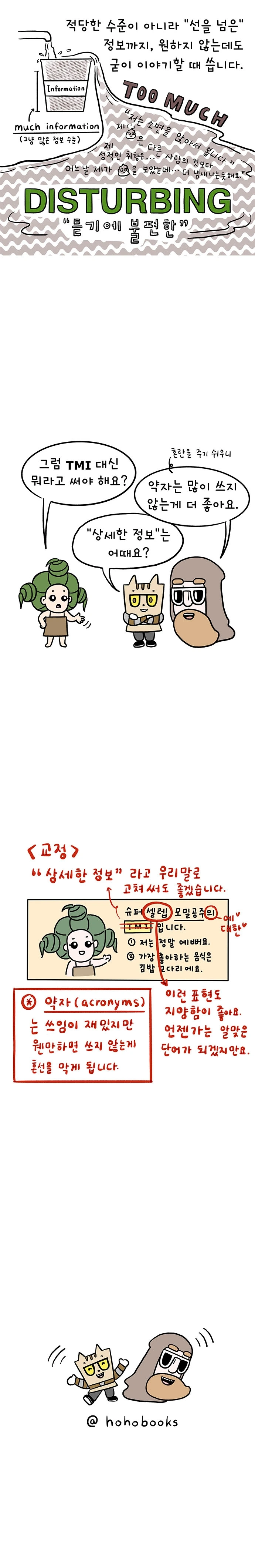 TMI 라는 약자가 여기저기에서 사용되는 것을 많이 볼 수 있는데 원래 의미와 용도가 아니라 그냥 "상세한" 정보, "자세하게 말하자면" 정도로 잘못 쓰이는 것 같아서 이 부분을 설명하는 만화를 그렸습니다. TMI의 의미가 잘못 받아들여져 쓰이는 것도 그렇지만 통신용어로 특히 많이 사용되는 약자(약어, acronyms)등은 함부로 쓰면 혼선을 불러일으키기 쉬워 웬만하면 쓰지 않으심이 좋다고 생각합니다. 그리고 우리말 대체 표현이 있다면 굳이 영어 단어를 쓰는 대신 우리말로 쓰는 것이 어떨까요?