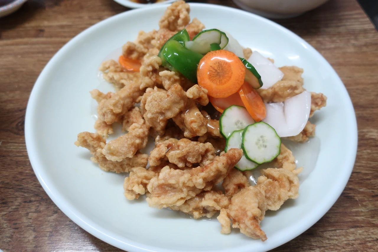 반골기질이 있어서 말이야, 남들 다 시키는 건 왠지 시키고 싶지 않은 그런 느낌이랄까, 다들 고기튀김 먹고 있으니 나는 탕수육이 먹고 싶었다 이 말이야. 근데 소스가 이렇게 소박하게 담겨 나오는 걸 보니 주인장 선생님은 고기튀김과 소스가 함께했을 때 완전하지 못할 것을 이미 알고 계셨던 건 아닐까라는 생각이 든다 이 말이야. 소박하게 나오다 보니 채소들도 다소 박한 느낌이 있어서 괜스레 오이소박이가 먹고 싶었다 이 말이야.