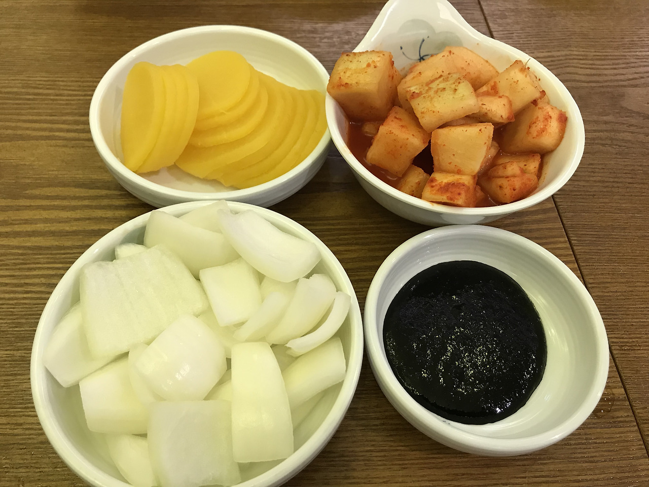 이렇게 중식 밑반찬 삼대장...이 아니라 사대장이 나타났네? 단무지, 양파, 춘장, 깍두기. 깍두기를 타이핑하려니 손가락이 내 몸이 아닌 것 마냥 어색하게 작동한다. 생경한 느낌이지만 한국땅에서 중식을 팔고 있으니 김치맨의 심경을 고려한 한중합작 반찬이라 생각하자.