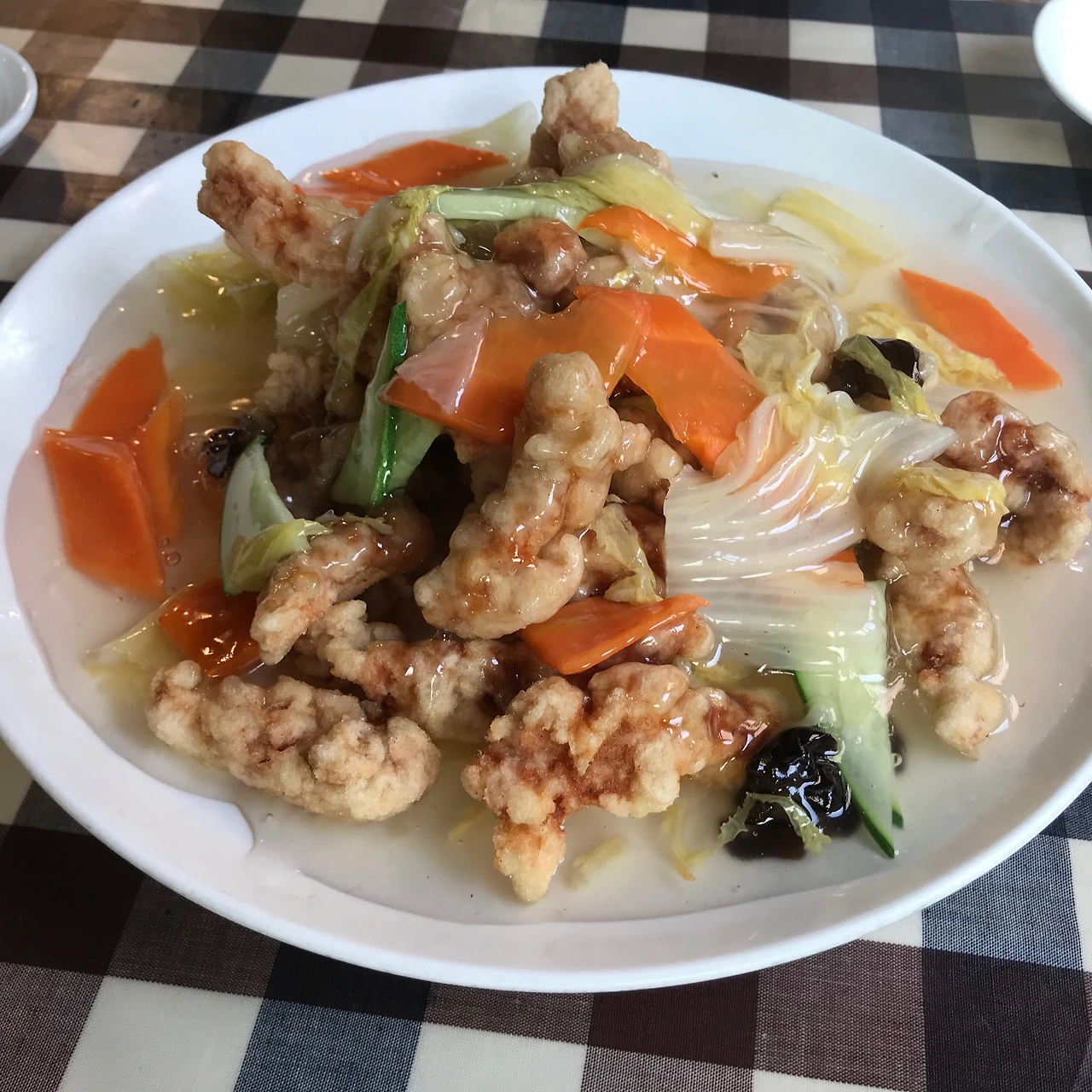 아니, 이렇게 보니 탕수육은 굉장히 평범한데 테이블보가 정말 비범하다. 경양식 돈가스를 썰어야 할 것만 같은데 탕수육이 올라가 있으니 이런 게 바로 인지부조화인가 보다.