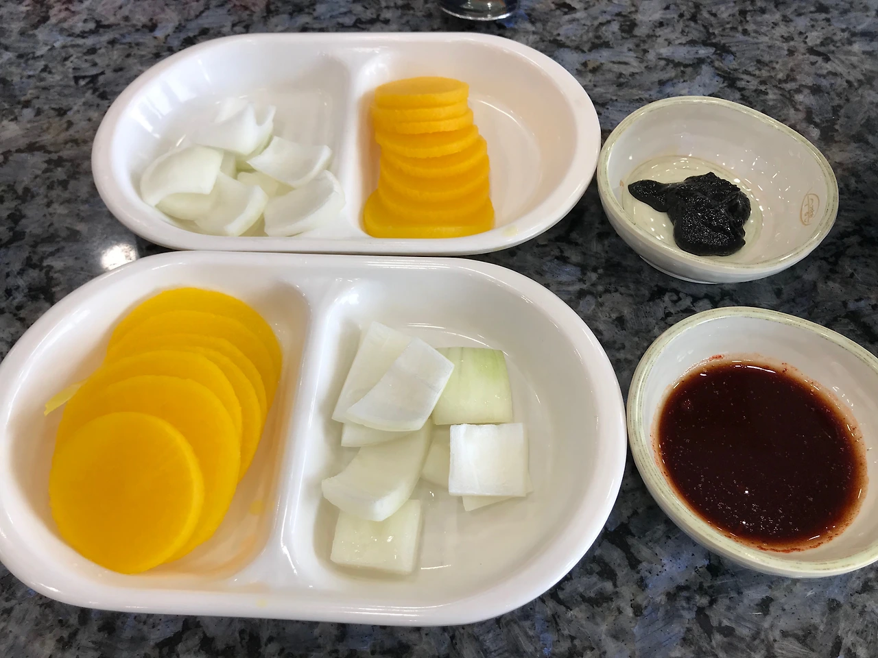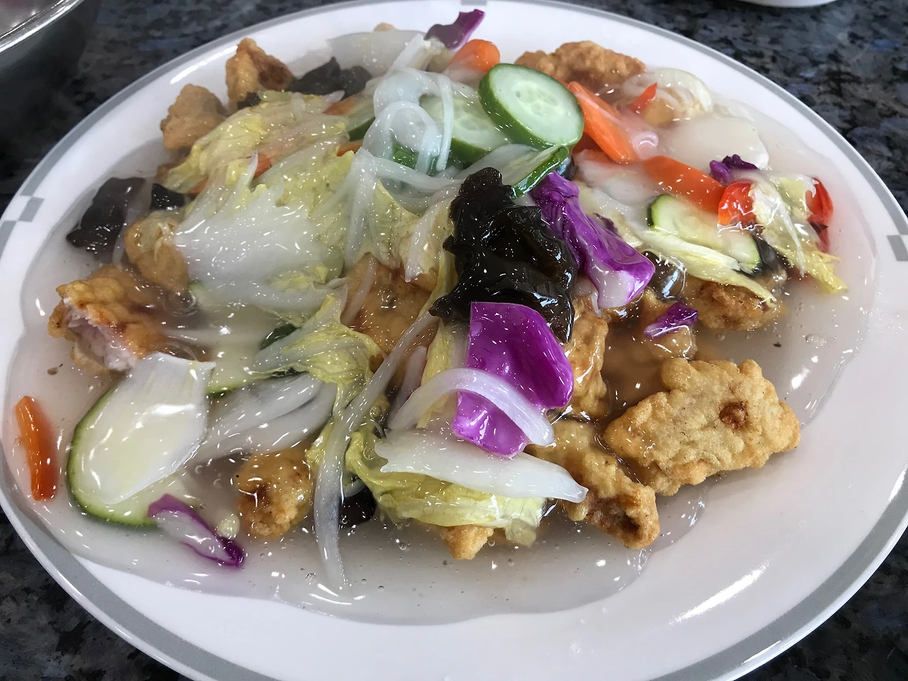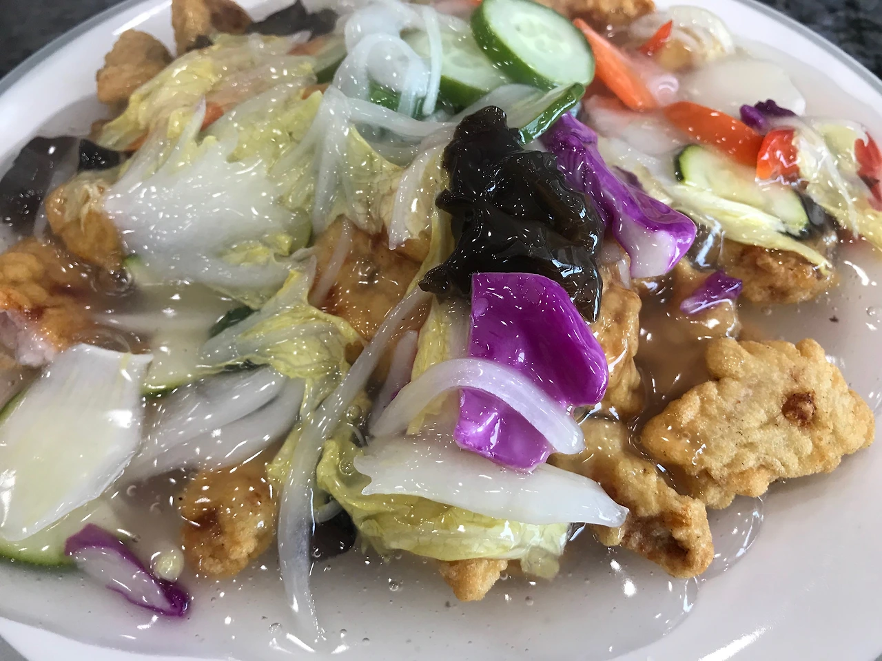 내 마음처럼 투명하다. 소스를 끼얹었음에도 그 속이 훤히 내비치는 정도라면 소스가 있는 것과 없는 것을 시각적으로 구분해내기가 쉽지 않아 마치 그냥 고기튀김을 보는 것 같은 착각에 빠진다. 이렇게 보니 약간 탕수육 디오라마 같은 느낌이 들기도 한다. 명인의 솜씨를 너무 평가절하하는 것 같아 죄송한 마음이 드니 이쯤에서 그만하겠다.