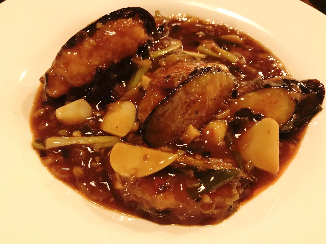 편으로 썬 가지 사이에 다진 새우를 집어넣은 것인데 누군지는 몰라도 이 요리를 처음 만들어 낸 사람에겐 정말이지 크게 상을 주고 싶은 부분이다. 쏘스가 또 얼마나 기가 막히던지 마지막 남은 한 방울까지 긁어 먹을뻔한, 거지왕 김춘삼도 울고 갈 맛이라 할 수 있는 부분이다.