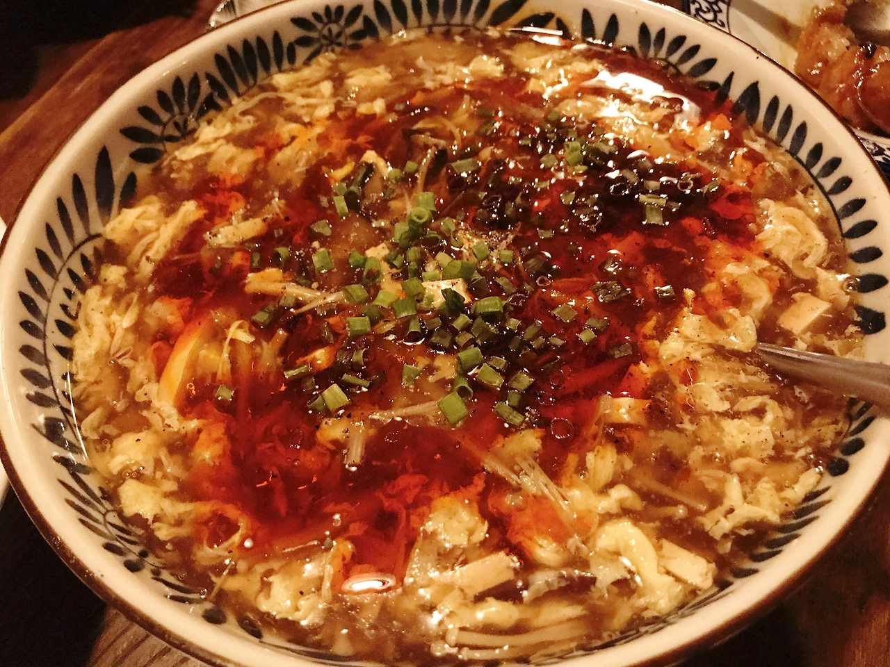 계란탕에 피를 띄운듯한 모양새인 게 다분히 그로테스크한 느낌을 주는, 일명 산라탕이다. 산라~ 산라~ 산라 머니. 에그머니.