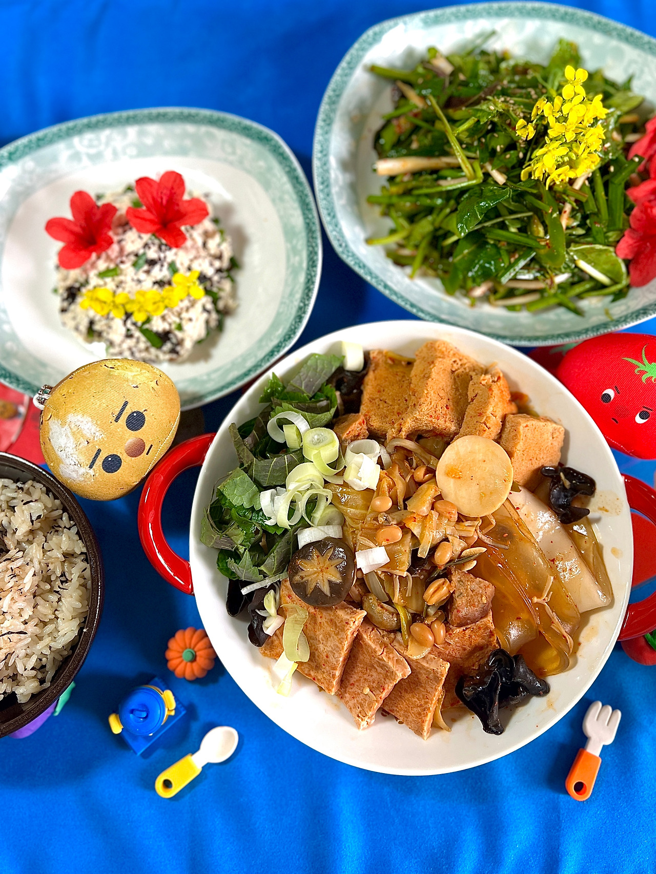 재료: 얼린 두부, 버섯(표고, 새송이, 목이, 느타리, 양송이버섯), 묵은지, 중국 당면, 분모자, 베이크드 빈스, 양파, 다진 마늘, 대파, 깻잎, 양배추, 풀무원_Like런천미트 (비건 런천미트 혹은 비건 소시지 등으로 대체 가능), 베지가든 떡갈비, 베지가든 한입 완자, 베지가든 궁중 너비아니