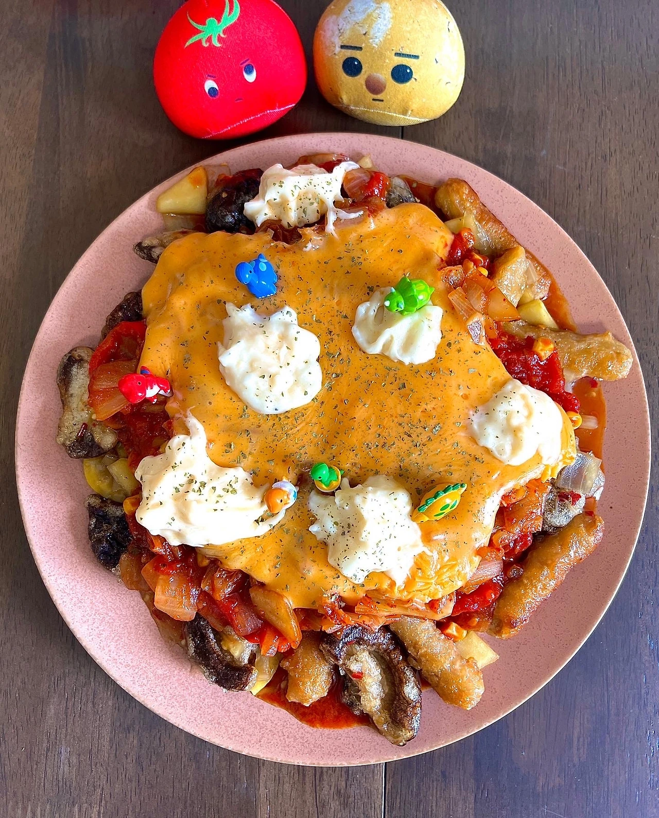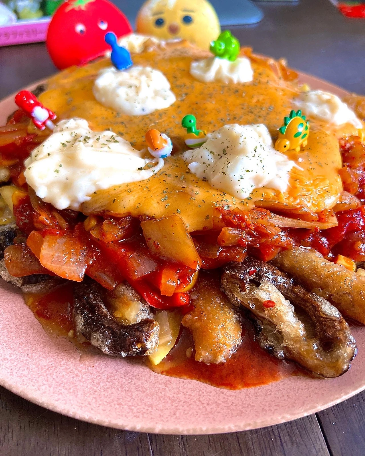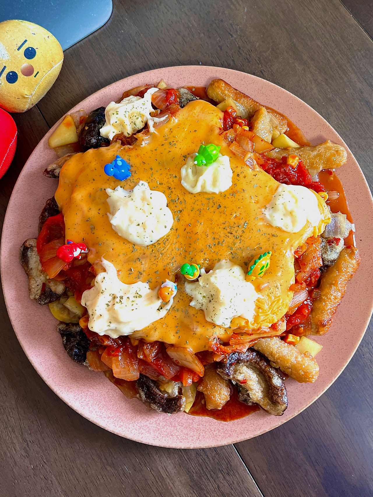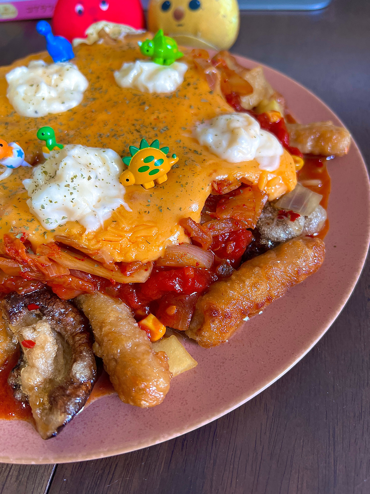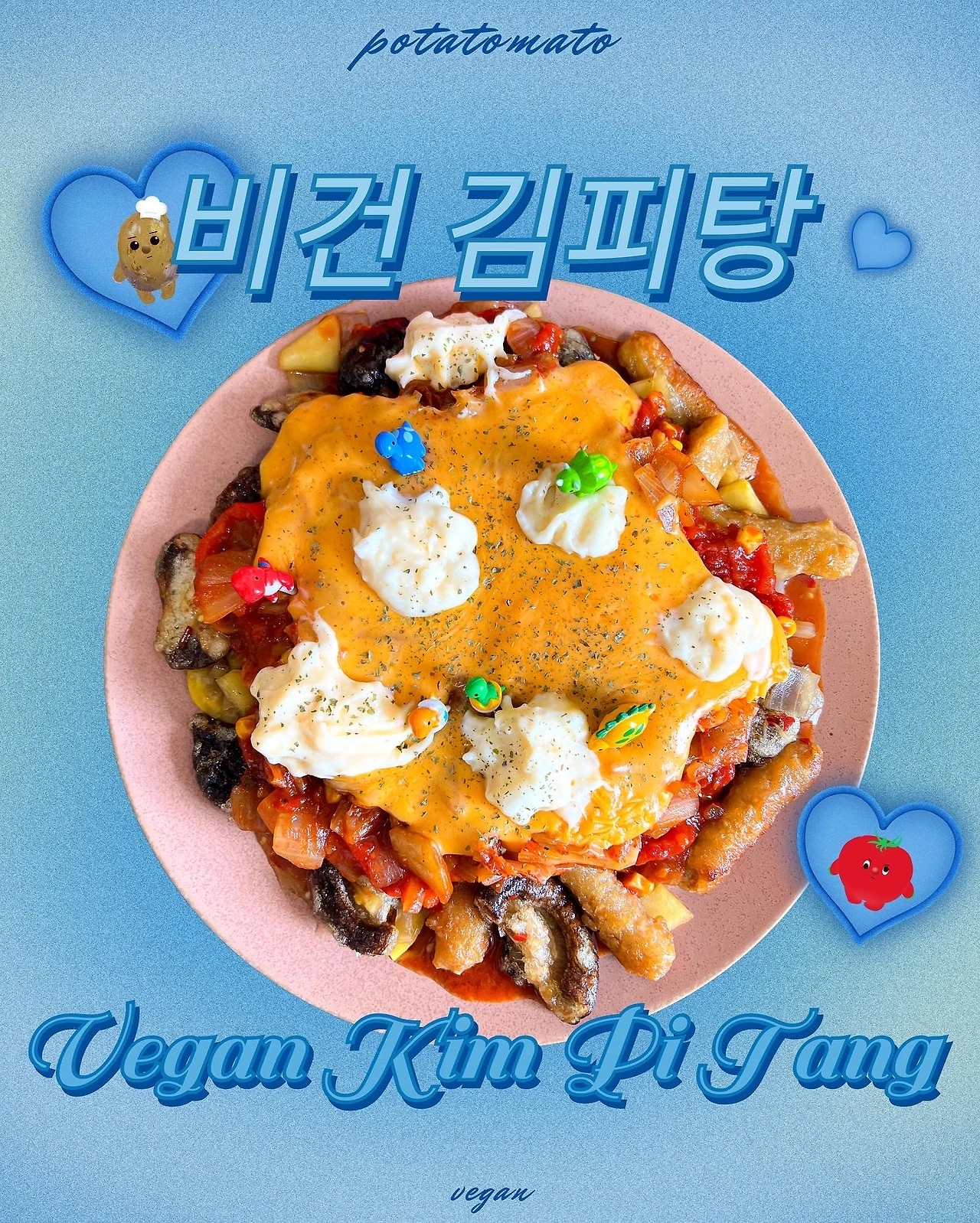 # 안 먹어본 사람은 있어도 한 번만 먹은 사람은 없다는 김! 피! 탕! 비건 탕수육이나 버섯 탕수를 넣고 만들면 더 담백하고 부담 없이 즐길 수 있다. 새콤달콤한 소스에 비건 치즈로 부드러움을 더하고 느끼할 수 있는 부분은 김치가 잡아주는 화려한 맛이 일품이다 ღ˘◡˘ற♡.。 oO