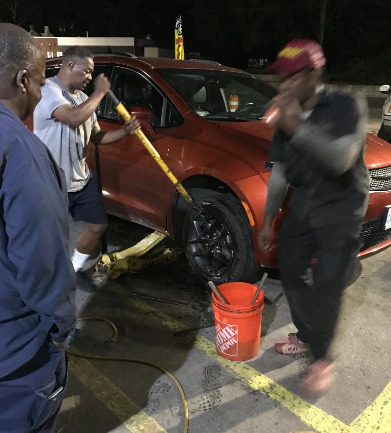 우리 차례가 되자 젊어 보이는 형 1이 바로 작업에 들어갔다. 몇 시간 전에 견인차를 기다리면서 인터넷에서 찾아본 것과 같이 형 1은 능숙하게 도난방지용 휠넛보다 약간 큰 소켓을 망치로 쳐서 휠넛에 끼워 넣었다. 그리고는 소켓에 렌치를 연결한 후 휠넛을 풀려고 하였다. 그런데 무슨 일인지 계속 헛돌고 말았다. 형 1은 'What the FXXX'을 외치며 다시 시도해 보았지만 이번에도 휠넛은 풀리지 않았다.