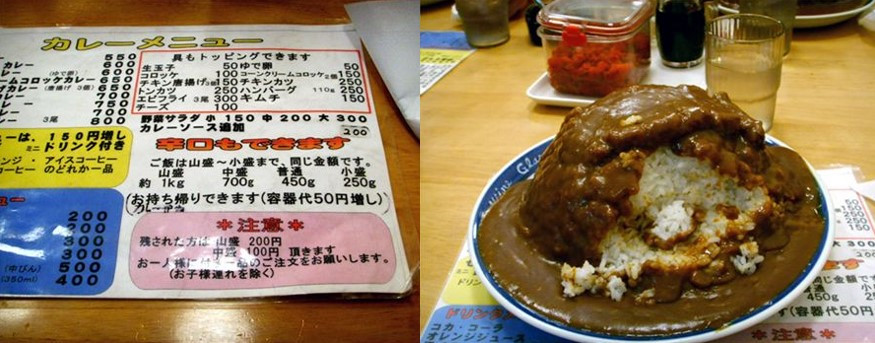 보통 밥의 양이 많으면 당연히 돈을 더 받을 텐데 이곳은 밥의 양에 상관없이 똑같은 돈을 받았다. 그리고 밥의 양은 소 250g, 보통 450g, 중 700g, 대 1kg에서 고를 수 있었다. 물론 먹다가 남기면 100~200엔의 벌금이 있긴 했다. 어쨌든 유도부 사람들은 여기에 오면 전통처럼 무조건 1kg를 시키기 때문에 다들 그렇게 오기 싫어했던 것이다.