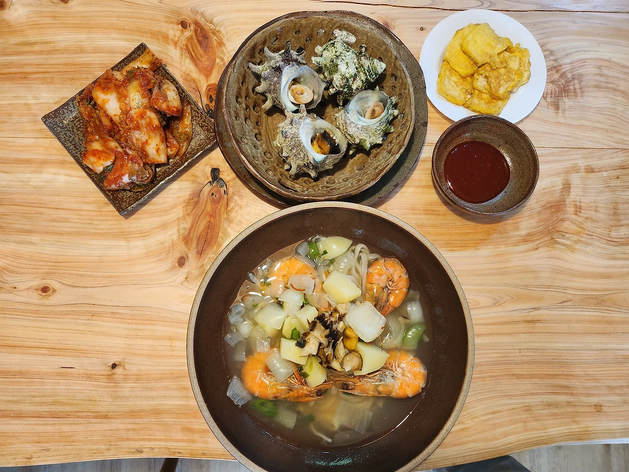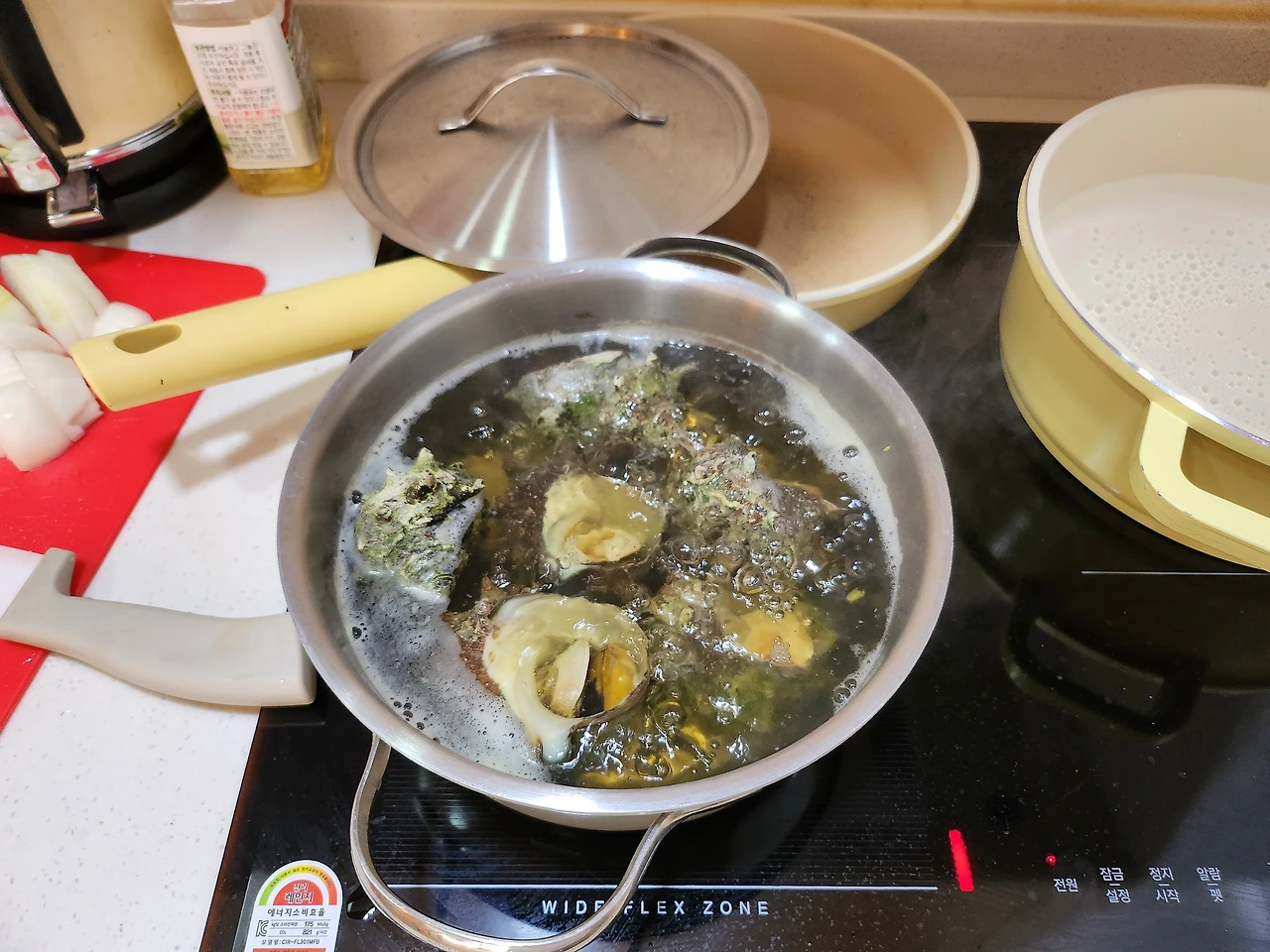 아침에 아이들을 등원시키고 남편과 집 앞 마트에서 장 봐온 소라를 세척하여 삶는다. 칼국수 물도 같이 올린 후 야채들을 송송 썬다.
