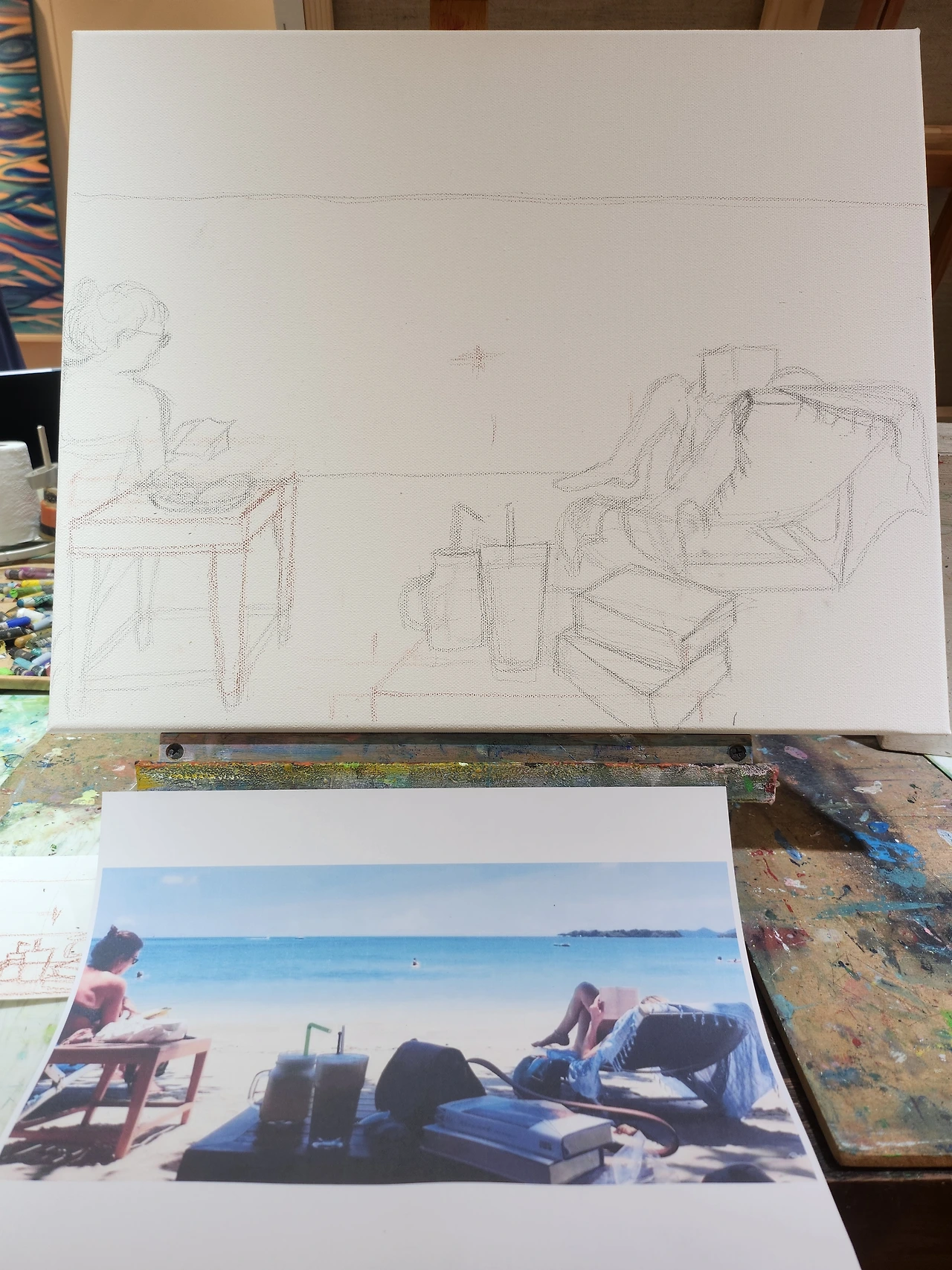신혼여행 때 예약된 일정 틀어져 갑자기 빈 하루가 있었다. 할 일이 없이 산책을 하다 발견한 작은 해변. 그곳의 평온한 아름다움과 우리의 마음이 떠오른다. 얼른 핸드폰을 다시 켜 사진첩에서 그때의 사진을 찾아 하나를 골라 화실 선생님께 출력을 요청한다.