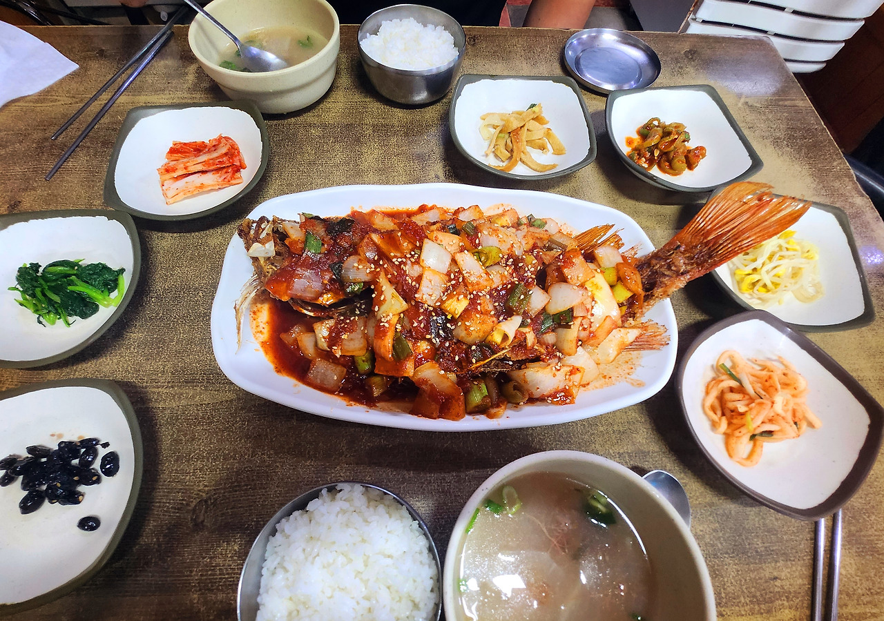 그렇게 거리도 가깝고, 속이 편할 것 같은 백반 정식집을 대충 택했는데, 막상 들어가 보니 우럭 전문점이어서 주인의 반강매에 우럭정식을 시키게 되었다. 허름한 식당 시설에 큰 기대 없는 상태에서 음식이 나오자 '간단히 먹을랬는데 양이 너무 많다'며 투덜거리며 떠먹은 첫 입은....!!!!!!!!!!
