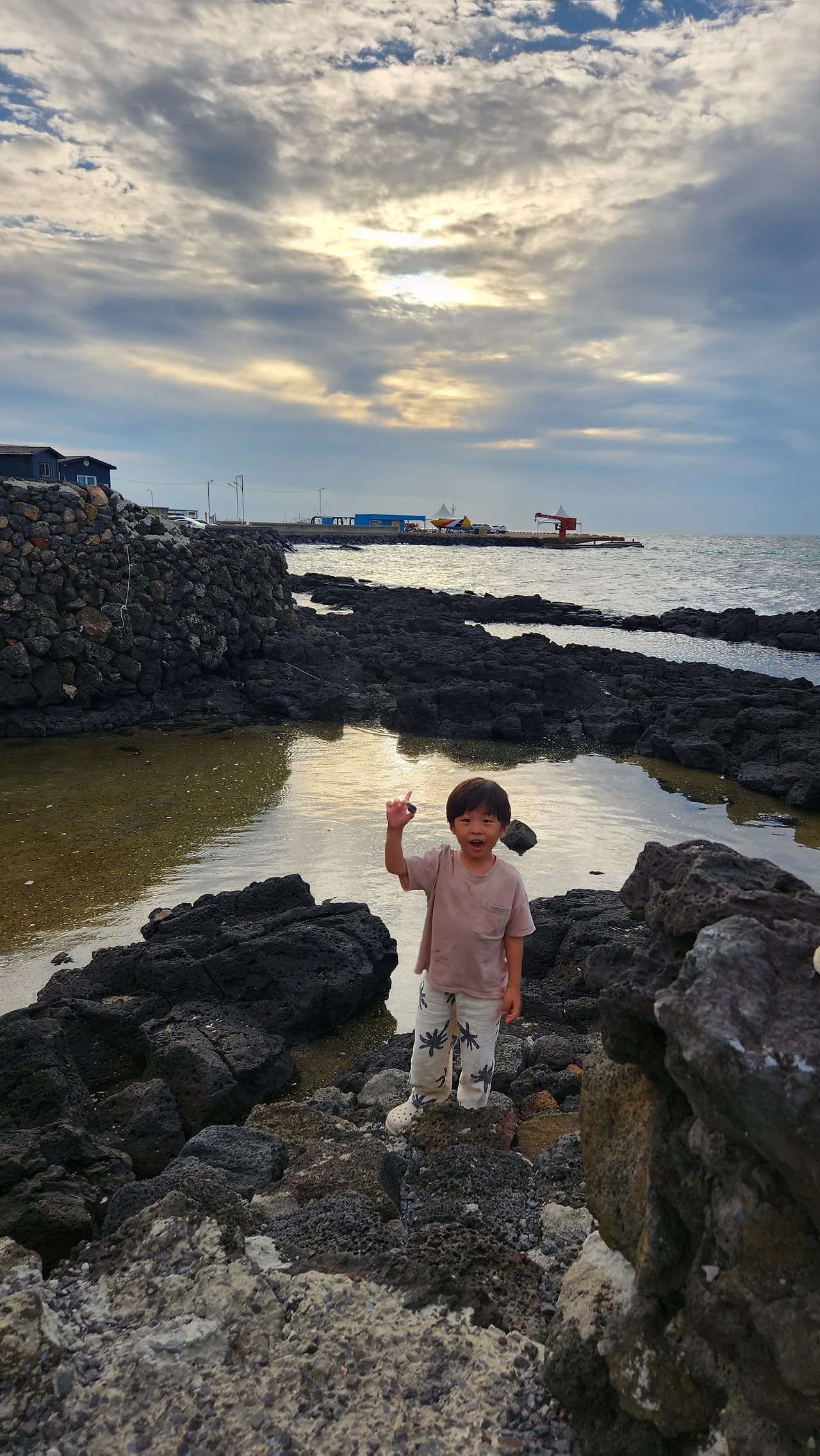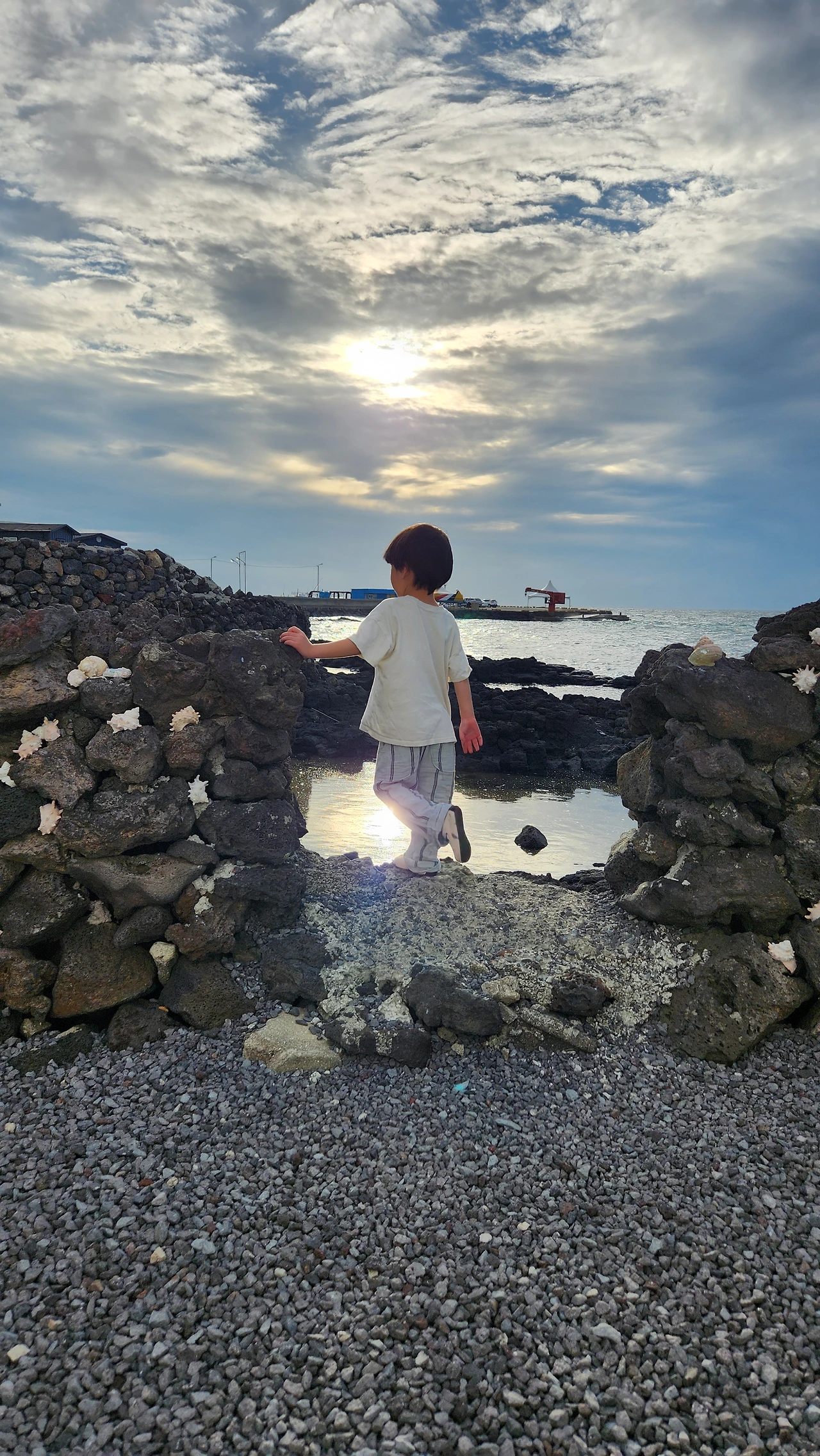 해수풀처럼 돌무리에 의해 고여있는 맑은 바닷물 위로 해님이 담기고
