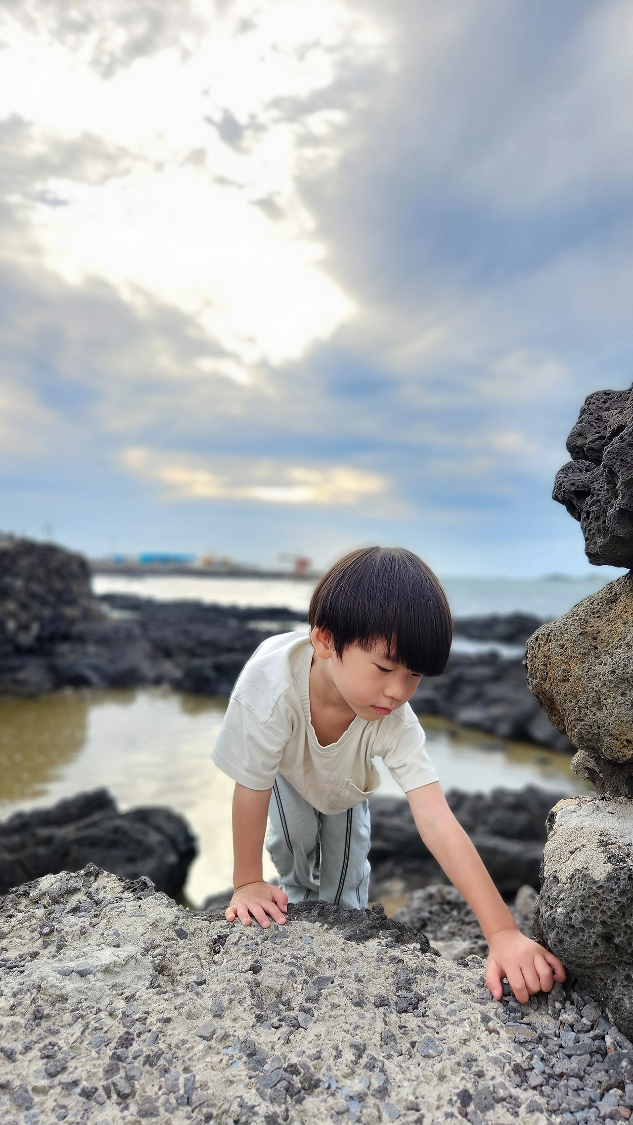 돌멩이에 소라에 호기심 충만한 율