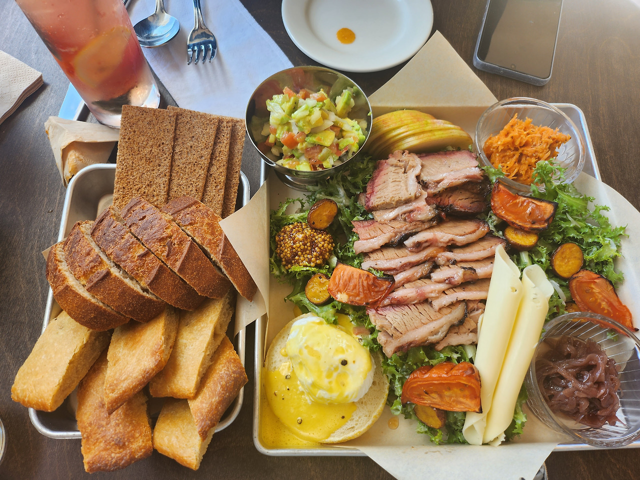 오늘은 집 근처 브런치 가게 중 저장해 둔 곳에 가본다. 표선 바다 근처로 주택들에 가려 바다가 잘 보이진 않지만 쾌청한 가을 하늘을 담기엔 부족함이 없다. 주문한 브런치 메뉴가 나온다. 남편은 양식을 좋아하지 않고, 특히 가격까지 36000원으로 너무 사악해 남편은 오늘의 아침 메뉴가 못마땅하다. 솔직히... 나도 재료가 고퀄임은 알겠지만 금액대비 막 엄청난 맛은 아님에도 자존심에 맛있는 척을 한다.^^;