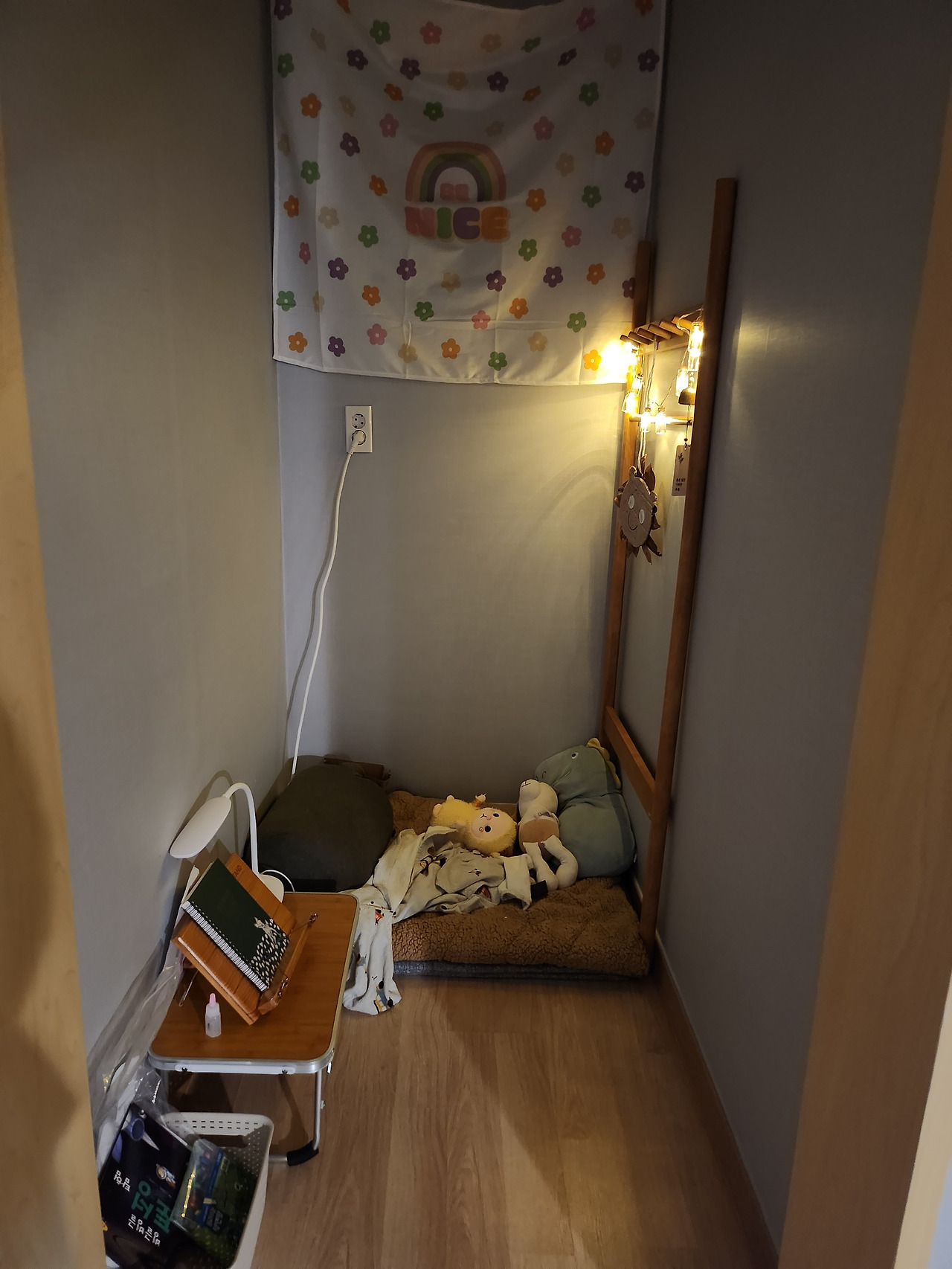 표선바다 산책 후 집에 돌아가기 전 다이소에 들러 장을 본다. 바로바로 ~ 아이들에게 '비밀의 방'을 만들어 주기 위해서인데, 이 숙소 1층 침실에 목적을 알 수 없는 어른 한 명 겨우 앉을 수 있을 정도의 작은 창고 같은 공간이 숨어있다. 처음엔 캐리어 따위의 짐을 숨겨두기 좋아 창고로 사용하였는데, 나의 상상력이 발동하기 시작했다.